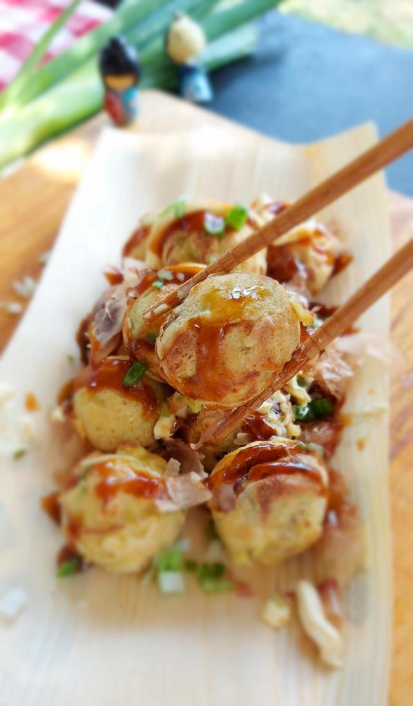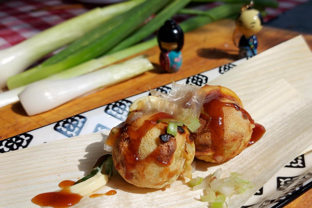 Sbattere l’uovo e la farina aggiungendo a filo il brodo dashi tiepido, ottenendo una pastella semi liquida. Aggiungere il cipollotto sminuzzato e accendere la padella dei Takoyaki. Spennellare bene ogni incavo con un pennello e olio di semi di sesamo. Versare la pastella cercando di riempire tutti i buchi e tutta la superficie della padella, aggiungere i pezzetti di polipo precedentemente tagliato a piccoli pezzi. Mentre si solidifica la pastella, con un pò di manualità che verrà col tempo, rivoltare e rimboccare la pastella nei buchi formando le palline.