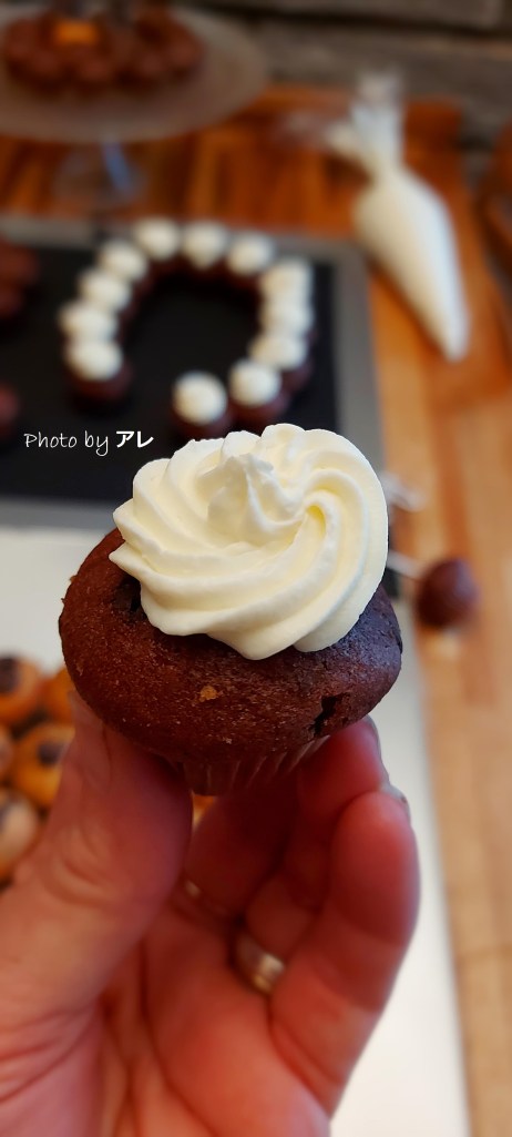Ho realizzato un frosting con 300 gr di mascarpone e 150 gr di latte condensato, frullandoli insieme e inserendo poi il composto in una sac a poche. Ho decorato ogni mini muffins con il frosting.