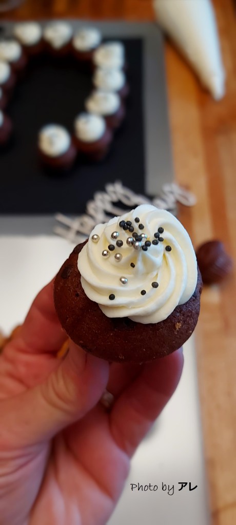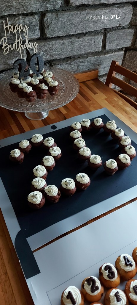 I muffins che compongono il numero venti sono stati decorati con confettini neri e argentati