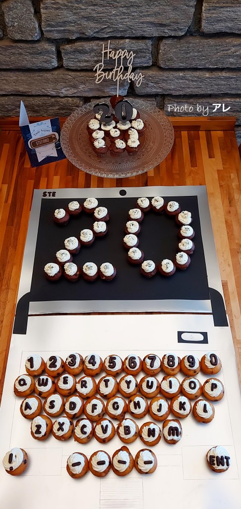 Ho pensato di realizzare una sorta di simpatico PC in onore del festeggiato, studente universitario di informatica! Ho realizzato lo schermo con un cartoncino argentato come base e un cartoncino nero per lo schermo. Sotto ho tracciato alcune righe per delimitare il touchpad e la tastiera. Ho poi posizionato i mini muffins al cioccolato sul “video” formando il numero venti e ho messo in sequenza corretta, come nelle tastiere dei pc, i muffins bianchi posizionando le lettere e i numeri di cioccolato sopra il frosting.