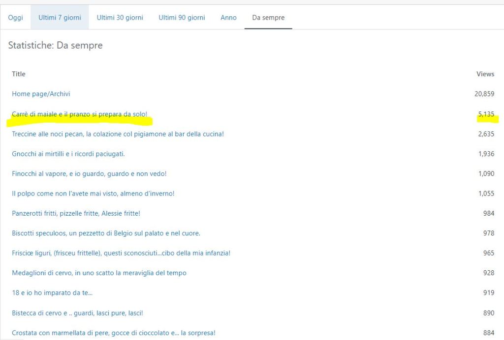 Parlando di cose più leggere e anche futili rispetto a tutto ciò che succede nelle nostre vite, torno a fare una sorta di bilancio di Piattoranocchio, e sorrido davanti a queste meravigliose statistiche, per me molto di più di quello che mi aspettavo, per una piccola passione come la mia! A tanti sembrerà una goccia nell’oceano se paragono il mio blog ad altri che hanno 10000000000 di visualizzazioni, ma nel mio piccolo, 126.000 visite sono…..INCREDIBILI!