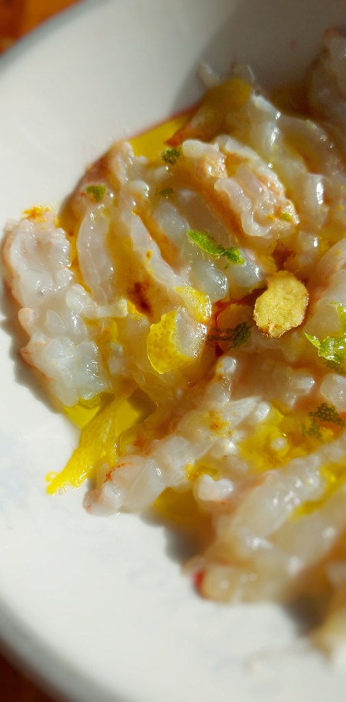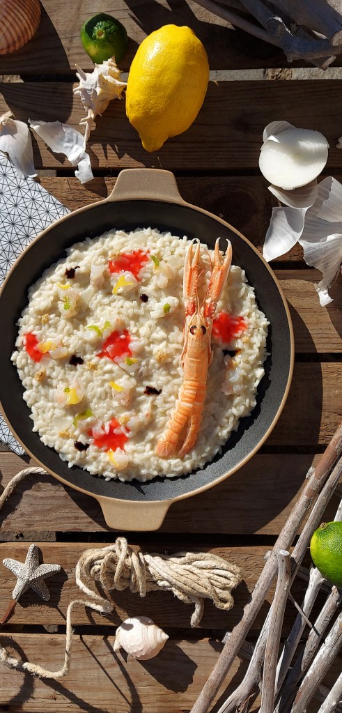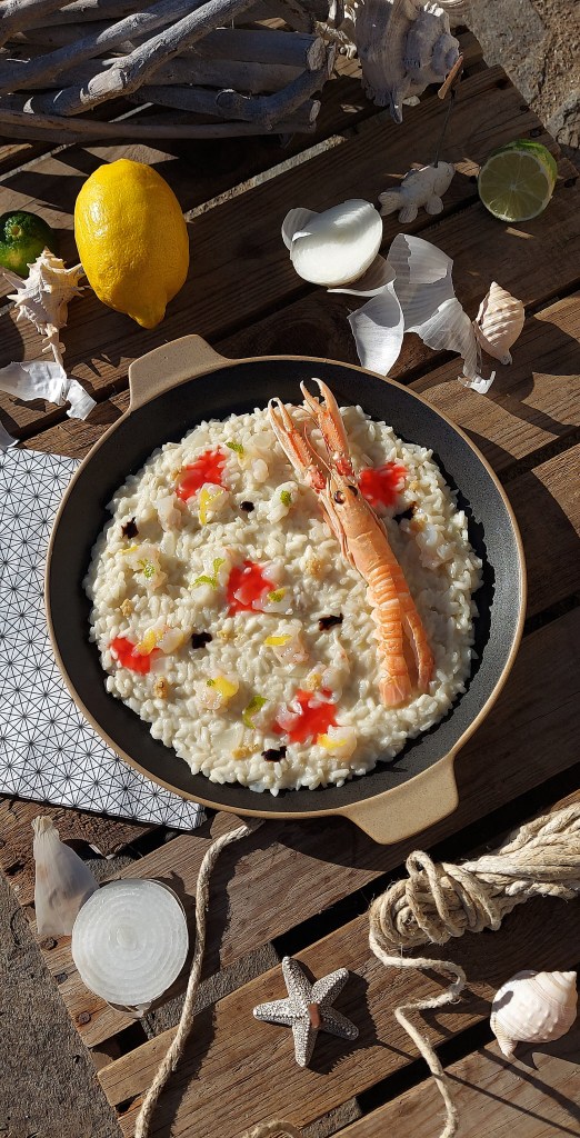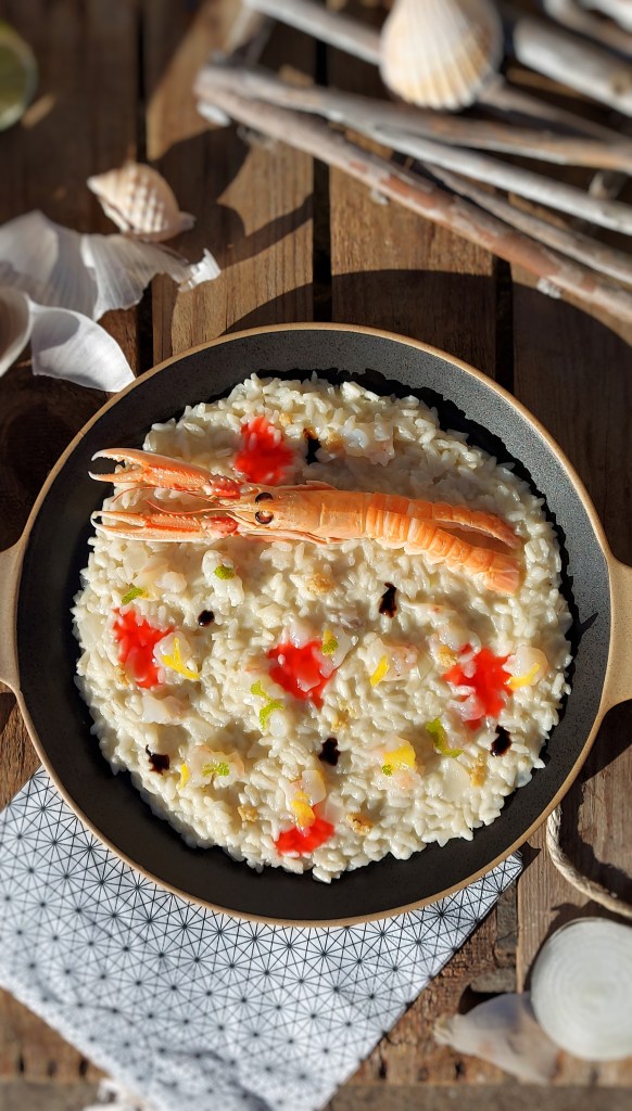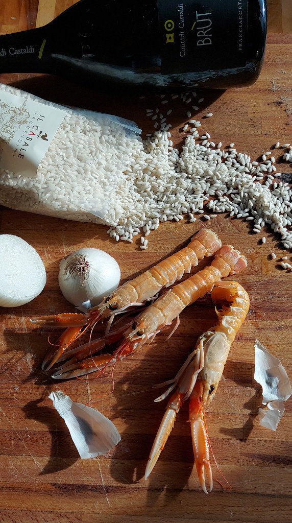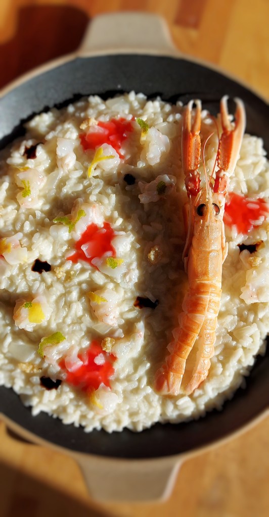 Oggi il mio pranzo prevede un risotto al prosecco per finire circa mezza bottiglia aperta l’ultimo dell’anno. Volevo però che fosse speciale. Ho marinato per circa 2 ore gli scampi con un filo di olio extravergine, il succo di mezzo lime, polvere di zenzero e di wasabi e zeste di limone. Nel tostare il risotto ho utilizzato solo poca cipolla bianca e l’ho cotto solo col fumetto di pesce ottenuto dai carapaci degli scampi, con sedano, carota e sale.