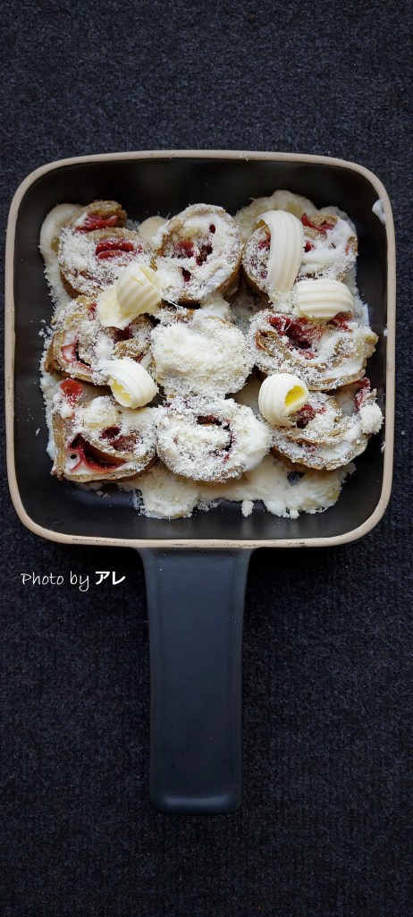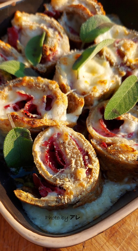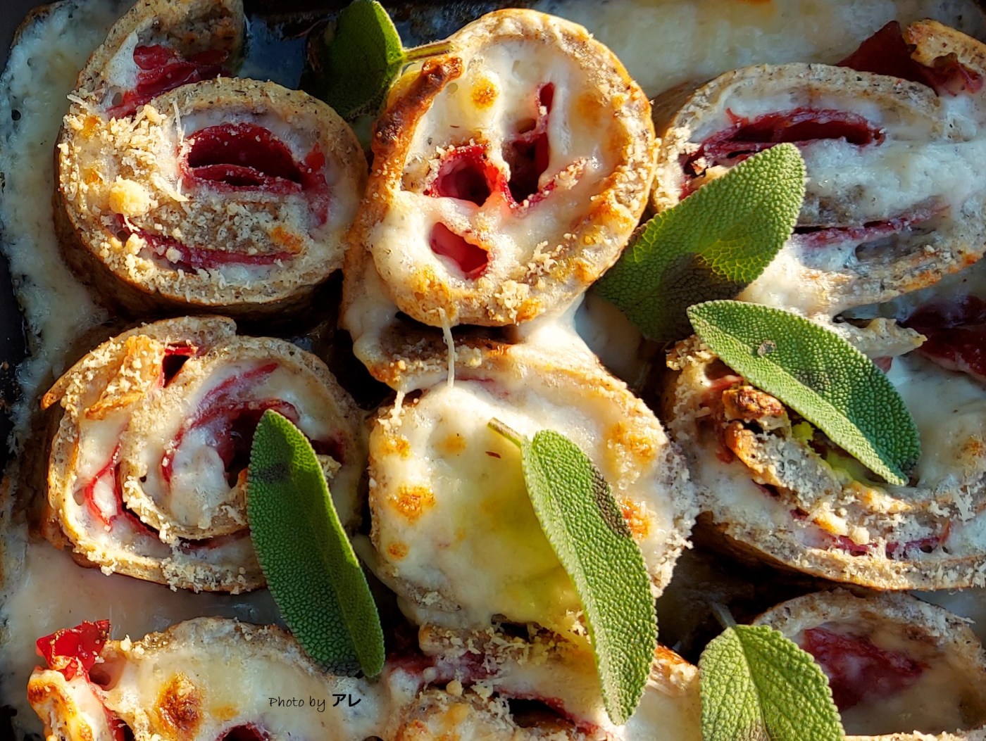 Sporcare il fondo di una teglia grande o di teglie monoporzione di besciamella al formaggio, disporre le girelle capovolte, unire ancora qualche cucchiaio di besciamella fino a finirla, spolverare con il Parmigiano Reggiano, aggiungere burro a pezzetti e qualche foglia di salvia. Gratinare le manfrigole in forno a 220°C per circa 10/15 minuti.