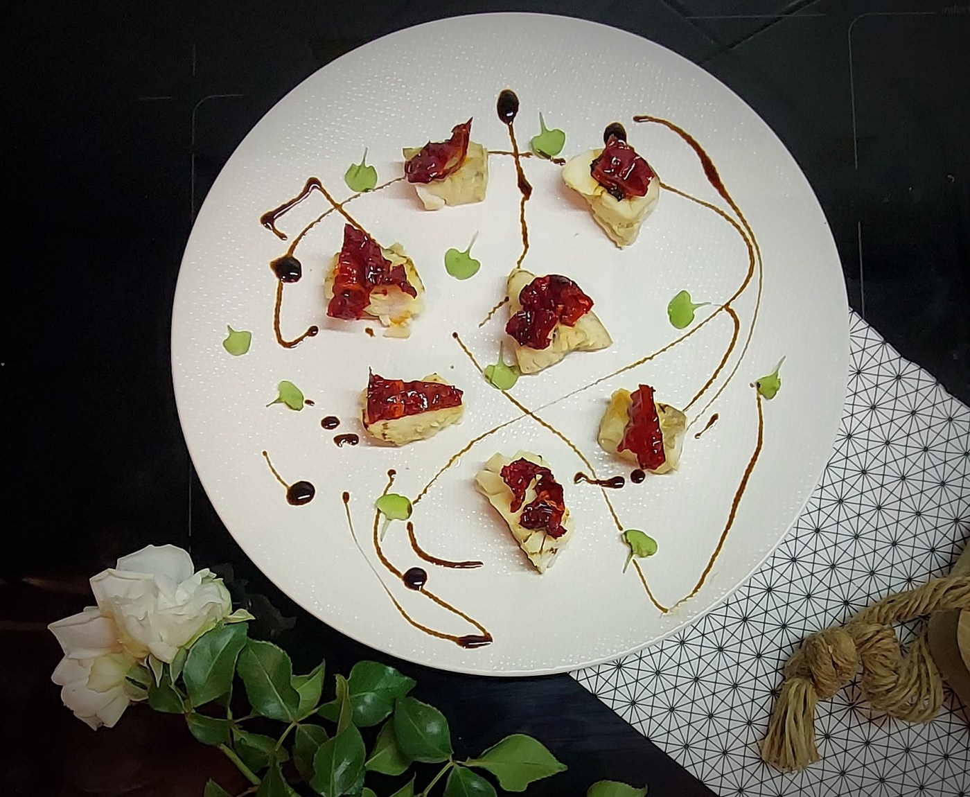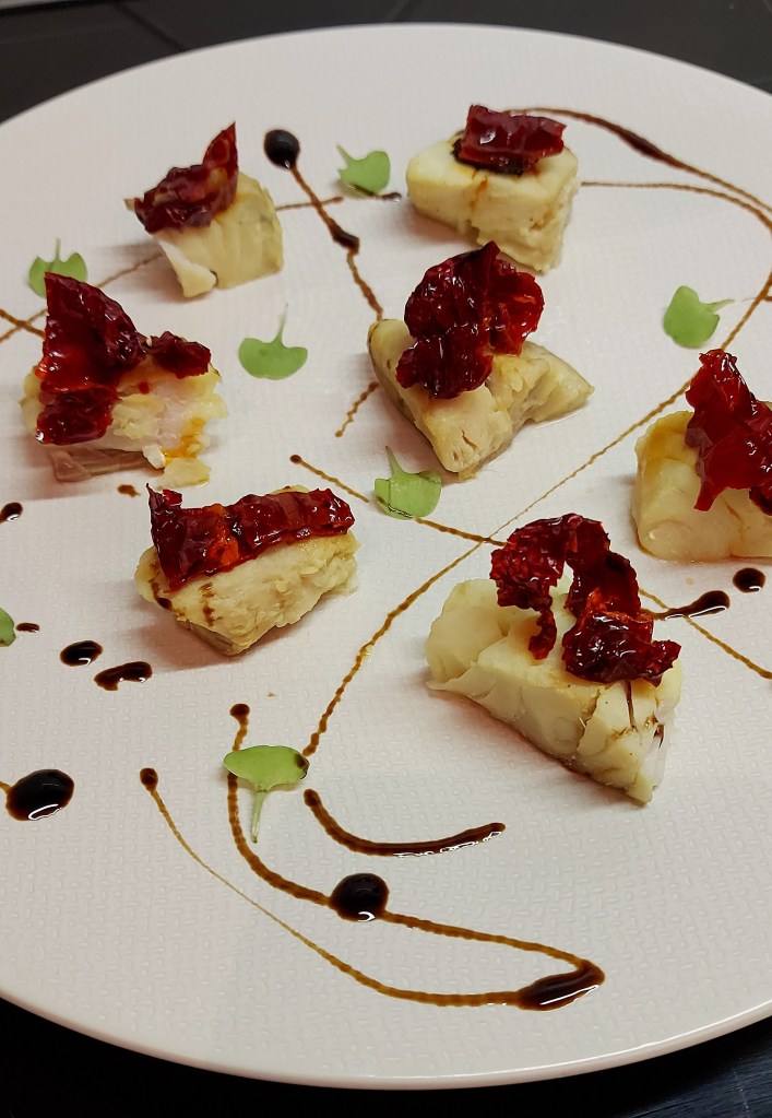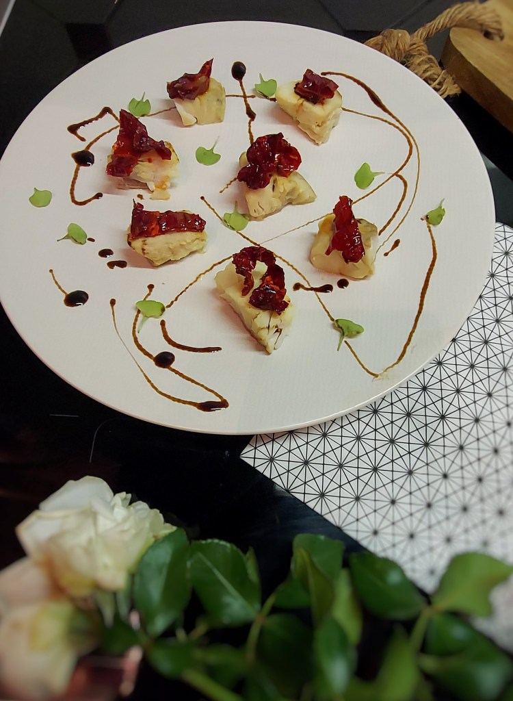 In una vaporiera di bambù (o quella classica) far cuocere i cuori di merluzzo mettendo nell’acqua dei sapori come: mezzo limone, alloro, pepe nero in grani. Ci vorranno circa 15 – 20 minuti. Con la forchetta provare a vedere la consistenza. Disporre sul piatto i cuori divisi in tanti pezzetti, su ogni pezzetto adagiare sbricciolando molto grossolanamente un peperone crusco, fare un giro di salsa di soia o di crema di aceto balsamico.