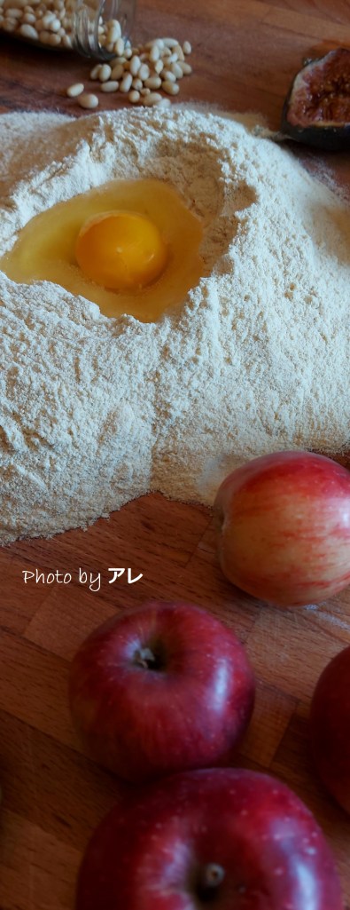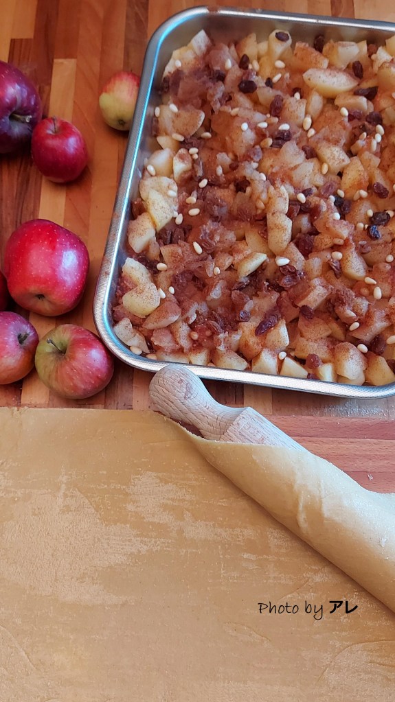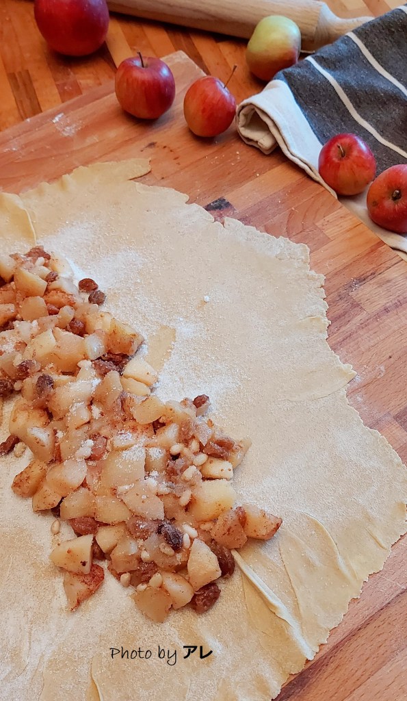 Impastare la farina con il sale, l’uovo, il burro e poco per volta l’acqua, tutto con le mani in una lavorazione lenta e gentile, di almeno venti minuti. Ottenere una palla liscia e omogenea che non si attacca alle dita. Riscaldare una ciotola, meglio se in alluminio, versandovi dentro dell’acqua bollente. Attendere un paio di minuti e svuotarla, asciugarla e capovolgerla sulla palla di pasta, che resterà al caldo. Lasciare riposare per almeno un’ora. Sbucciare e togliere il torsolo dalle mele tagliandole a cubetti tutti della stessa dimensione, riunirle in una ciotola con il succo di limone, lo zucchero di canna, l’uvetta bagnata con il rum, la cannella e i pinoli.