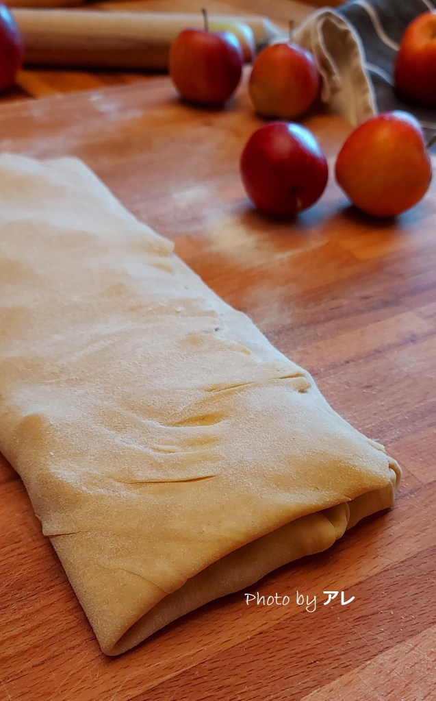 Stendere la pasta con un mattarello in una sfoglia rettangolare più sottile possibile. Sciogliere il burro senza farlo brunire, distribuire sul fondo della pasta e cospargere di pan grattato. (Questo trucco eviterà che mele troppo bagnate rilascino il sugo sul fondo dello strudel). Distribuire il composto di mele uniformemente, arrotolate la pasta sigillando molto bene i bordi.