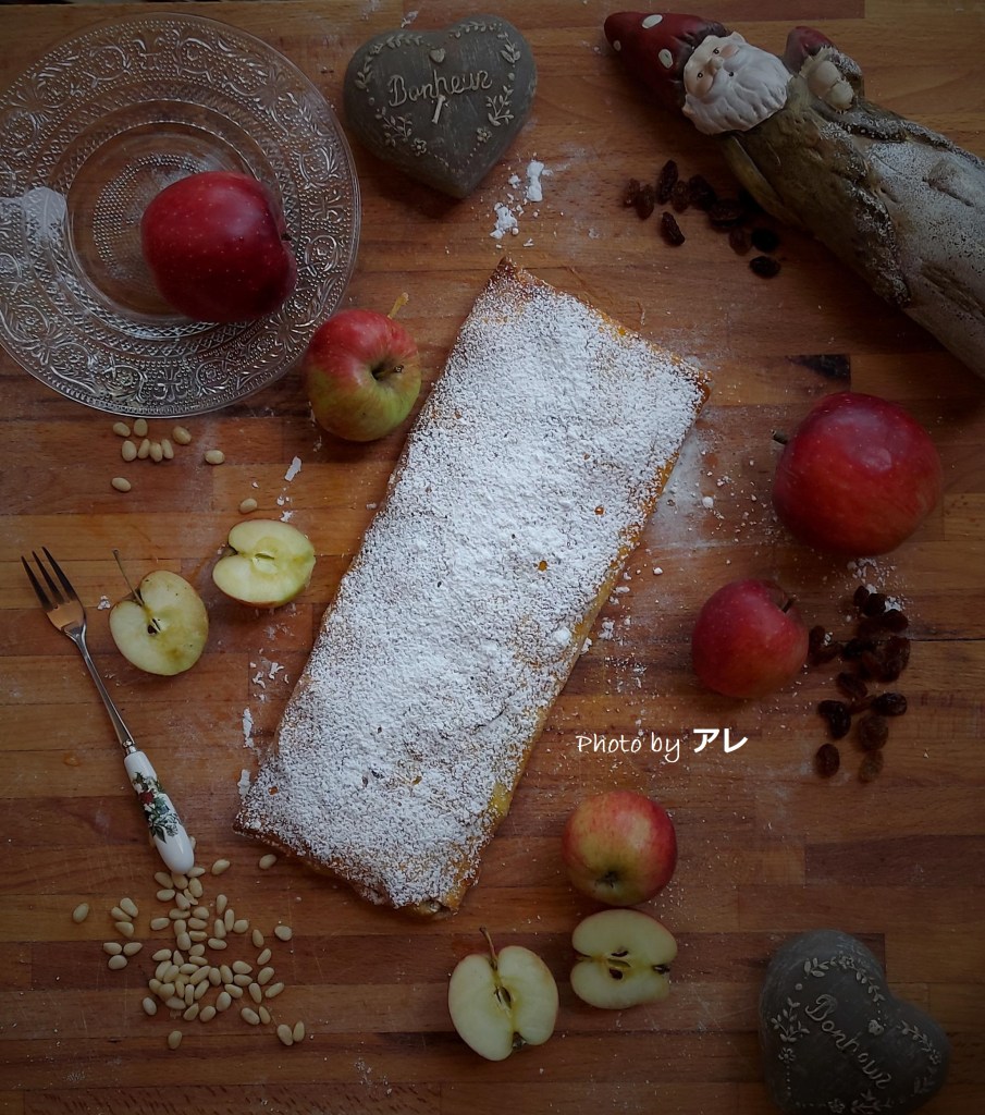 Non posso pensare di essere già nel pieno dell’autunno, non riesco a guardare il mio giardino tingersi di giallo, di rosso fuoco, di marrone. Mi perdo nel mio orto oramai spoglio, un pomodoro ritardatario, due peperoni che stentano a crescere, l’albero di pere che sonnecchia al tiepido sole, quello di pesche che osserva il ciliegio perdere ad una ad una le sue belle foglie. Non posso credere di esser qui ora, nel mezzogiorno, in canottiera, a crogiolarmi ancora ad occhi chiusi in attesa di una fresca e pungente brezza, per ritrovarmi poi con la copertina, mentre piove improvvisamente col naso appiccicato alla finestra a sospirare e ricordare l’estate. Ho voglia di un dolce che ricordi i colori intensi e i sapori dell’autunno, un dolce fatto e rifatto mille volte ma che mi regala sempre l’emozione negli occhi del dorato e del giallo della pasta, del gusto dolciastro delle mele e quello intenso della cannella. Uno strudel vero, di quelli che iniziano dalla pasta, che sprigionano persistenti profumi e che mi ricordano l’autunno oramai qui, con me.