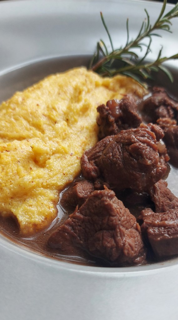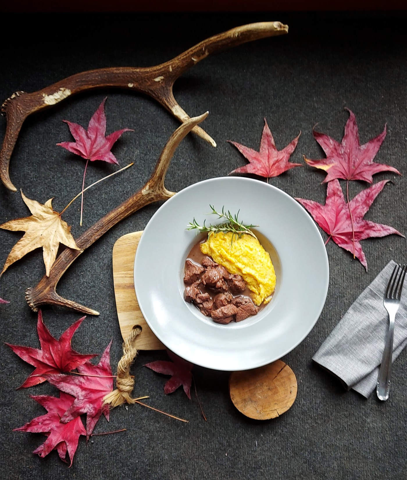 Servire lo spezzatino di capriolo con la polenta e il sugo.