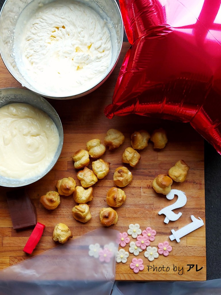Iniziate con il sole rosso, formando un cerchio abbastanza grosso, circa 13.5 cm di diametro, adagiarlo nella parte alta a destra di un bel vassoio grande bianco. Comporre ora il monte Fuji partendo dall’alto con 2 , poi 3 , poi 4 profiteroles e cosi via.