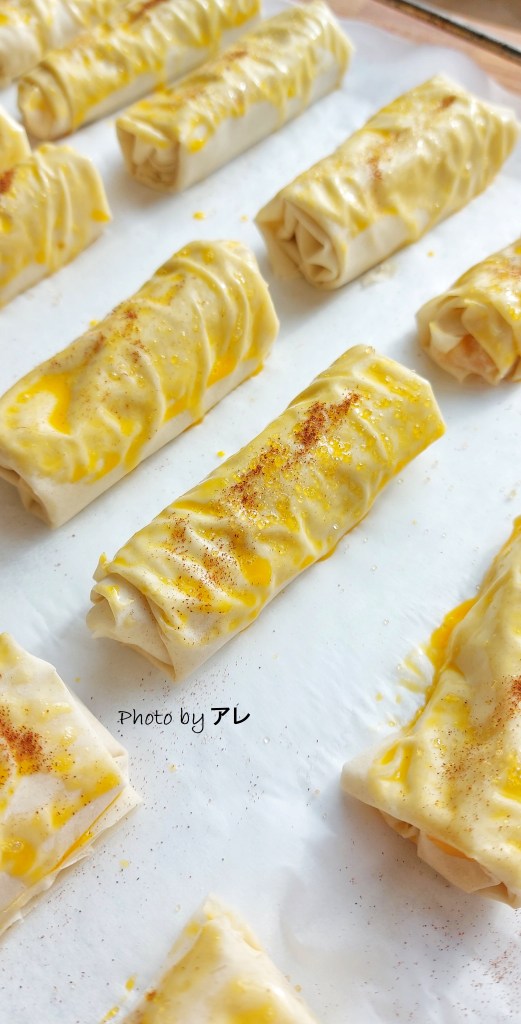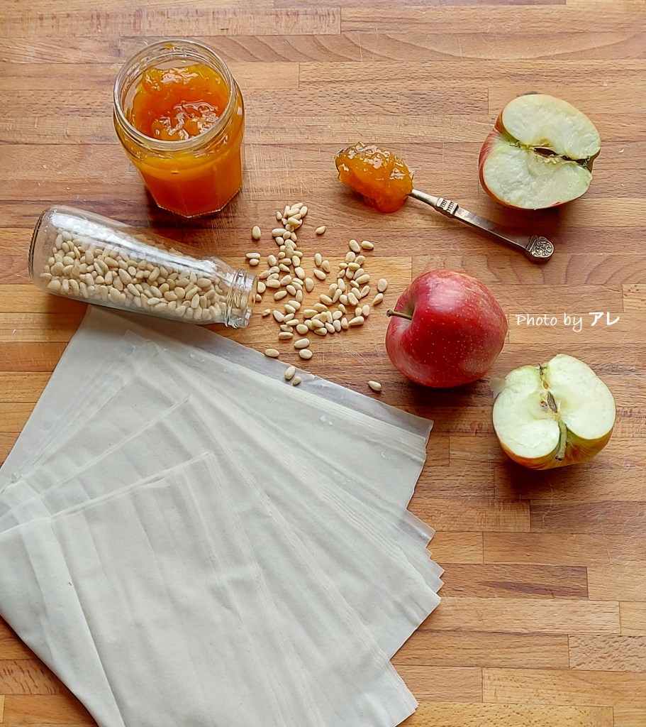 Tagliare la mela in spicchi poi togliere la pelle e il torsolo e tagliare a listarelle sottili. Prendere 3 fogli di pasta fillo sovrapporli bagnandoli leggermente con dell’acqua specialmente i bordi, tagliarli in 4 formando 4 rettangoli. adagiare un cucchiaio di marmellata sul lato corto del rettangolo, qualche pinolo e la mela.