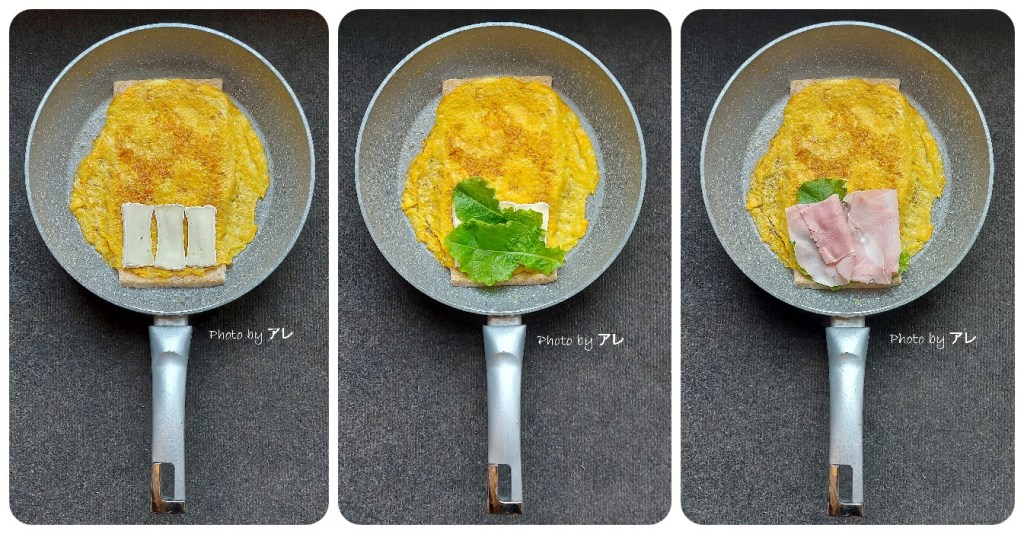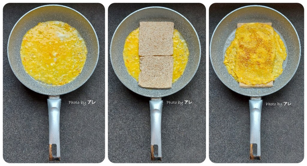 Prendere una padella antiaderente abbastanza grande da contenere due fette di pancarré una sopra all’altra. Far sciogliere una piccola noce di burro e dopo aver sbattuto con una forchetta un uovo, versarlo nella padella roteandola bene in modo da coprire tutto il fondo.