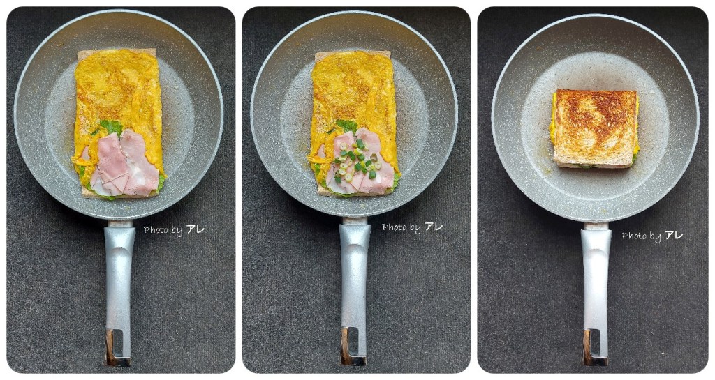 Chiudere le due ali laterali di frittata all’interno, guarnire con del cipollotto fresco e spostare la fetta di pane superiore su quella inferiore.