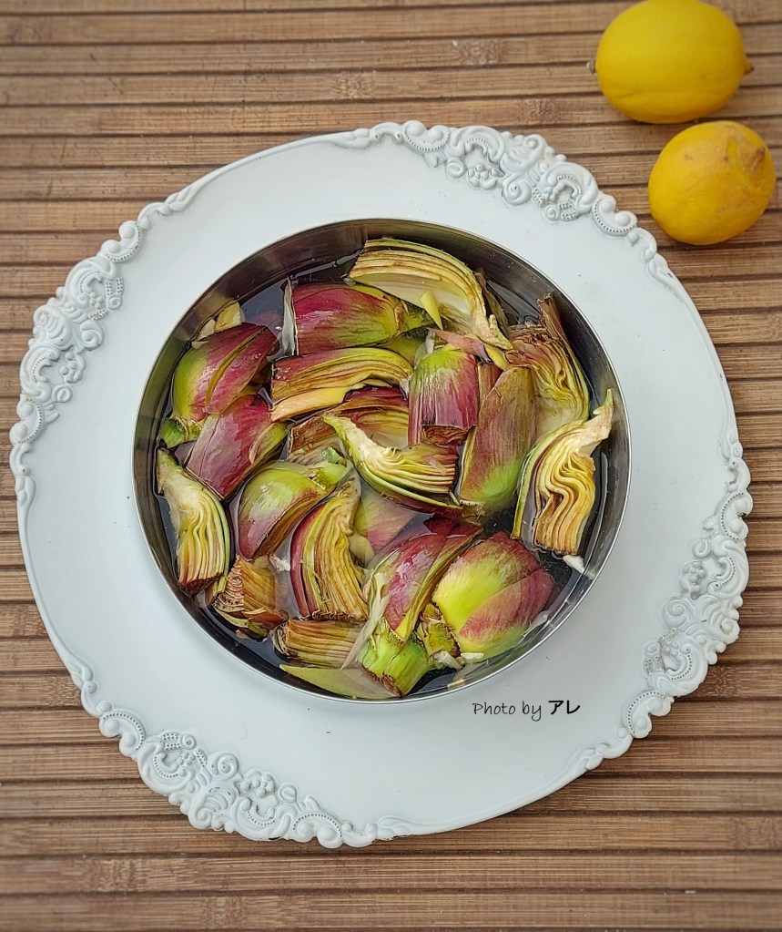Pulire i carciofi eliminando le foglie dure e le spine. Dividerli a metà e privarli della barba interna, metterli a bagno con acqua e limone.