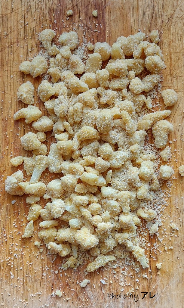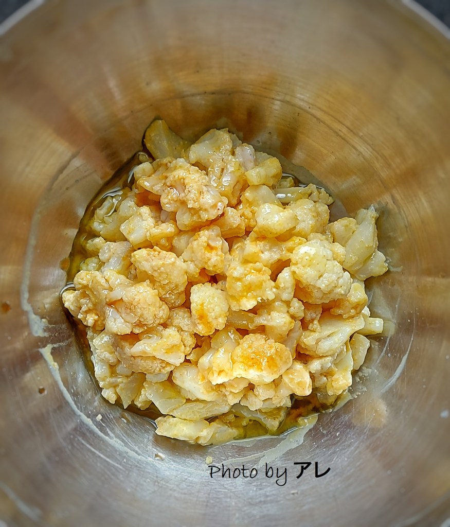 Tagliare il cavolfiore in cimette piccine, in una ciotola radunare le cimette, salarle pochissimo o omettere il sale del tutto se preferite, aggiungere un cucchiaio di salsa Tahina o maionese miscelato alla curcuma e alla salsa di soia. Mescolare affinché ogni cimetta sia ben coperta. In un sacchetto per alimenti mettere il pan grattato e un pugno di cimette alla volta, tenere ben chiuso e sbattere così che le cimette si impannino per bene.