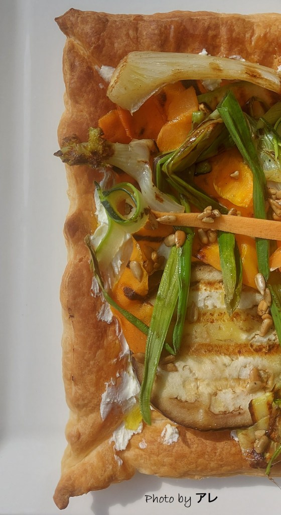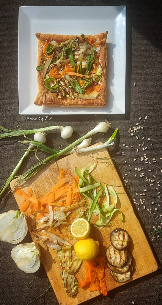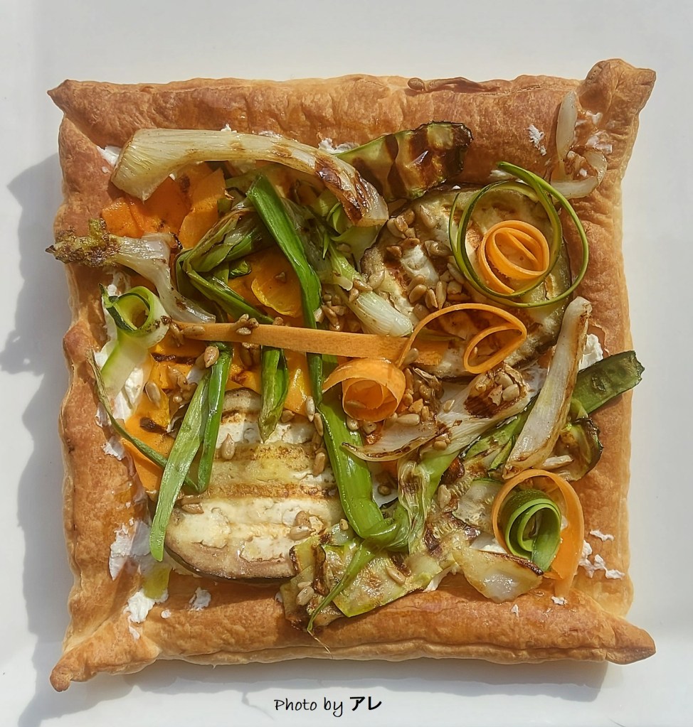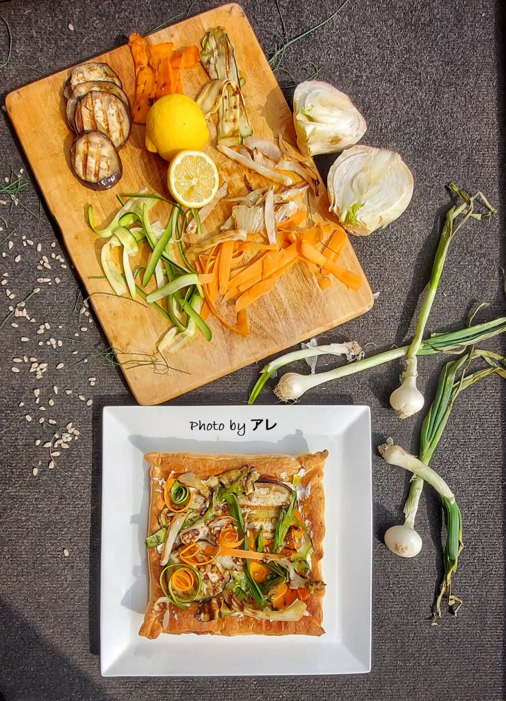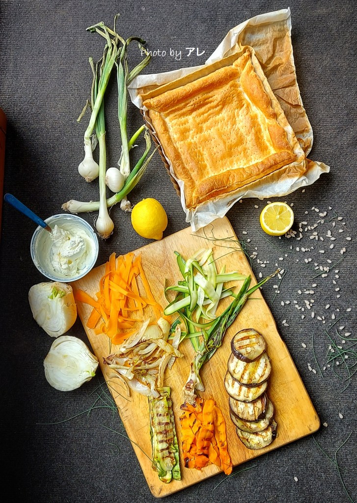 Tagliare la pasta sfoglia a metà ottenendo due rettangoli, bucherellare la pasta e spennellarla con olio extravergine. Infornarla a 180 gradi fino a che non sarà dorata e croccante. Intanto tagliare metà zucchina a veli sottili e metà a fette più spesse, fare la stessa cosa con la carota. Tagliare per il lungo il cipollotto, a fette il finocchio e la melanzana, irrorare tutte le verdure con olio extravergine e un pizzico di sale e pepe. Le fette più grosse di zucchine, carote, melanzane, i finocchi vanno grigliate per pochi minuti, anche le due metà di cipollotto passatelo sulla griglia per pochi minuti. Mescolate il philadelpia con il limone e l’erba cipollina. Spalmarlo sulla base di sfoglia croccante, aggiungere le verdure crude a veli e cotte grigliate, se volete erbe aromatiche fresche come origano, maggiorana, menta, poi un giro di olio al limone e semi di girasole tostati.