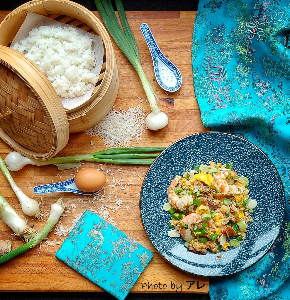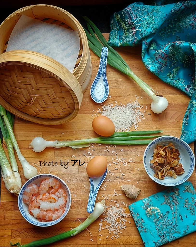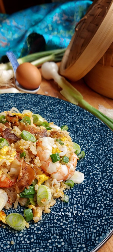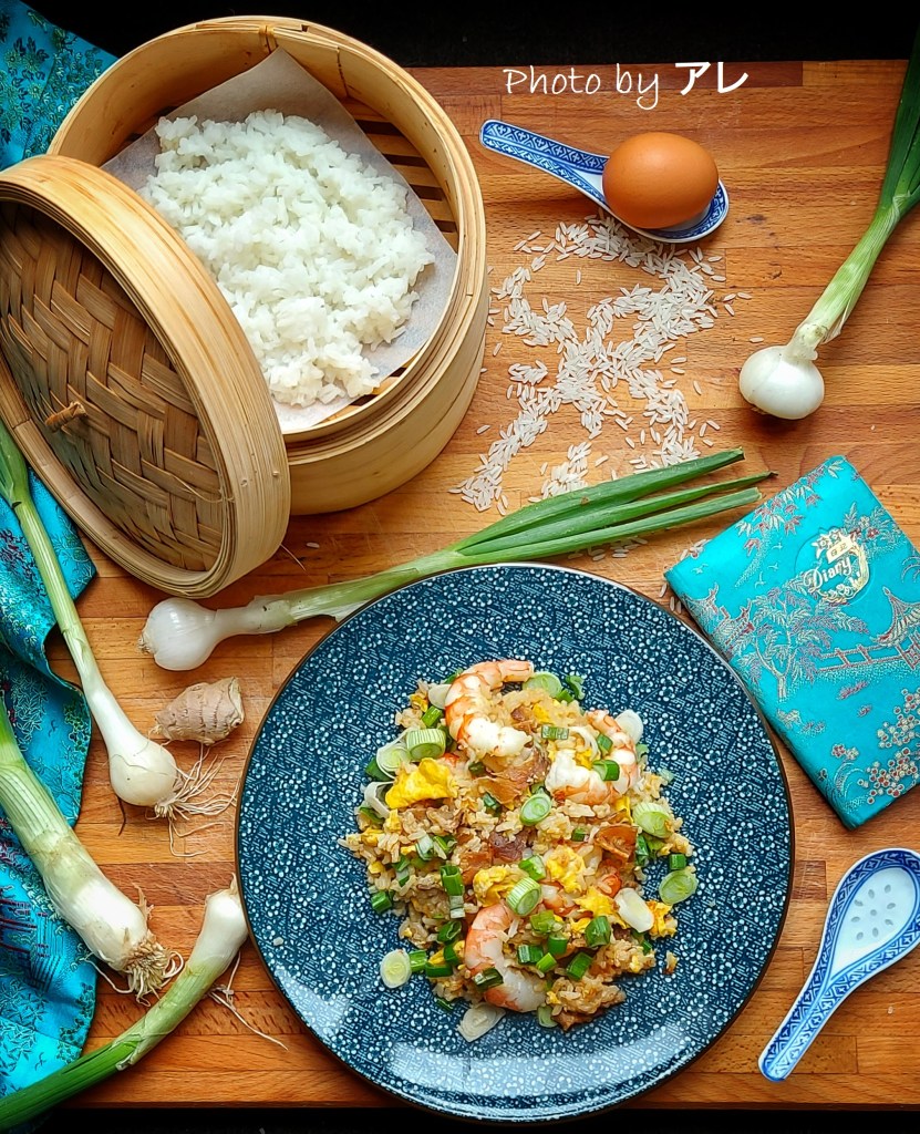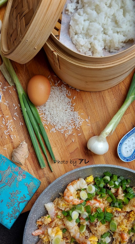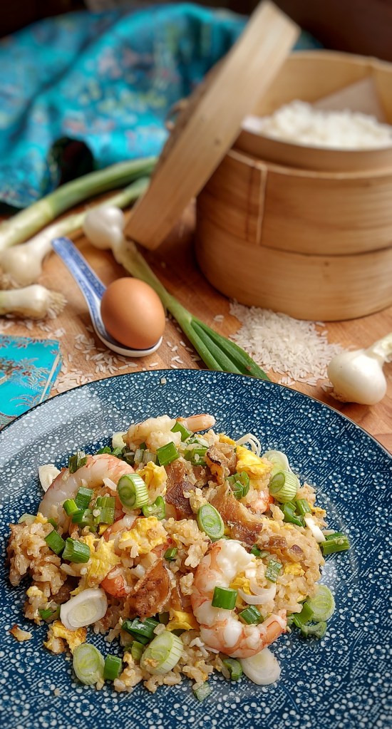 Cuocere il riso al vapore la sera prima, lavare e pulire i gamberi, tagliare il cipollotto a pezzetti. Tagliare anche la pancetta di maiale croccante a pezzetti. In un wok far scaldare l’olio, cuocere i gamberetti e appena sono rosa ma ancora morbidi toglierli e tenerli da parte.