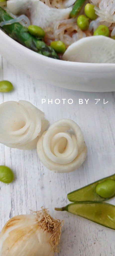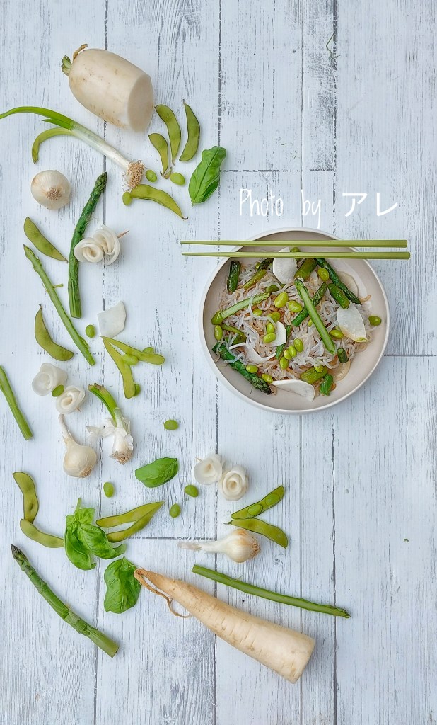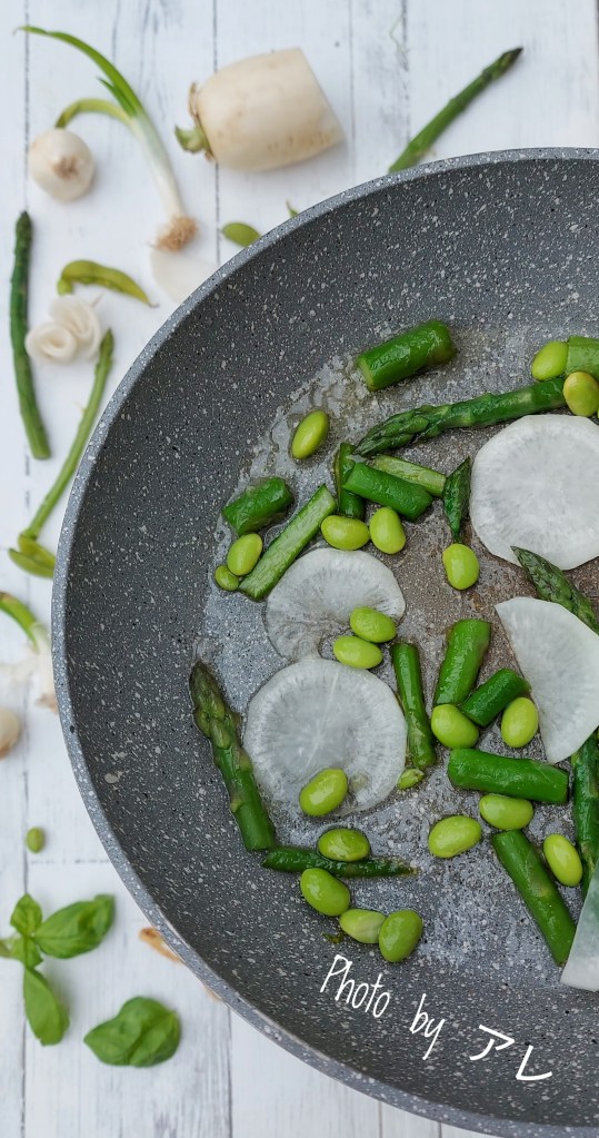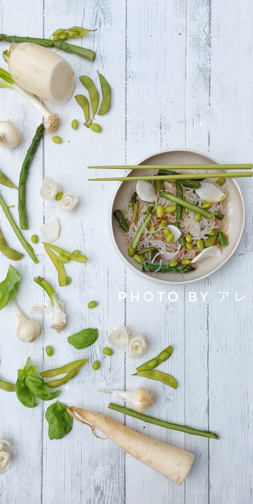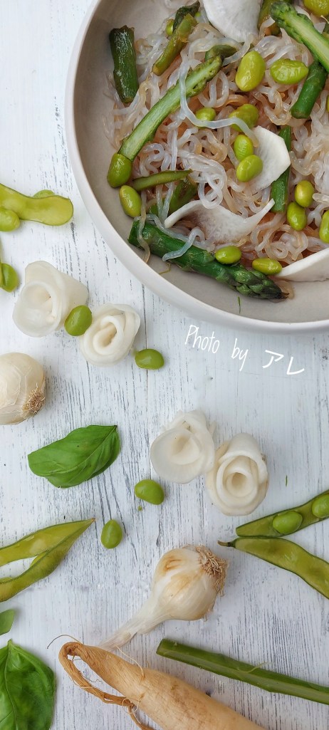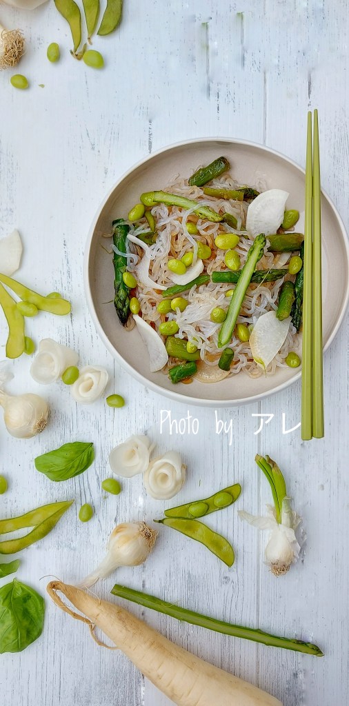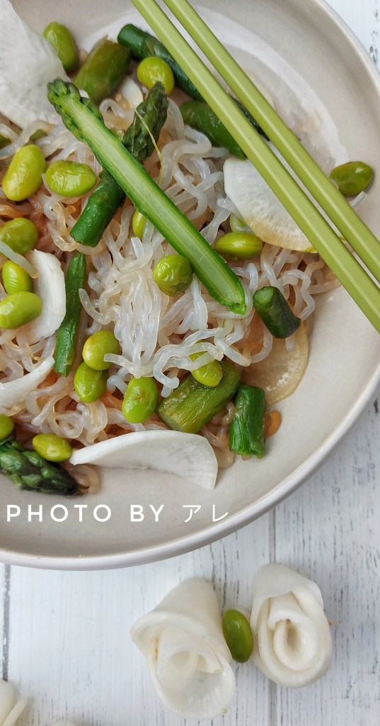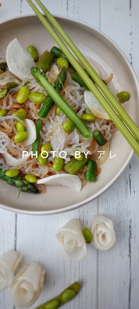 La pasta necessita di un solo minuto di cottura quindi, scoliamola, risciacquiamola sotto l’acqua corrente, immergiamola in una pentola con acqua bollente. Dopo un minuto scoliamola e teniamola da parte. Lessiamo le edamame per 3 minuti in acqua bollente. Lessiamo anche gli asparagi in acqua leggermente salata immergendoli dalla parte del gambo e lasciando fuori le punte. Basteranno 5 minuti se sono molto piccoli. In una padella scaldiamo l’olio di semi di sesamo con poco zenzero tritato, peliamo il daikon e ricaviamo delle fettine sottili, tagliarle a metà se troppo grosse. Tuffiamole nella padella con l’olio insieme alle edamame sgusciate. Facciamo scaldare tutto a fiamma moderata poi aggiungiamo anche gli asparagi tagliando il gambo in più pezzi. Quando le verdure saranno cotte ma ancora croccanti aggiungere gli spaghetti e far saltare tutto a fiamma vivace bagnando con la salsa di soia. Se piace cospargere di cipollotto fresco tritato direttamente nel piatto.