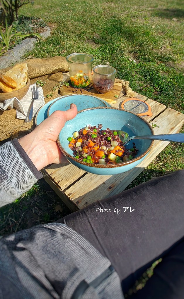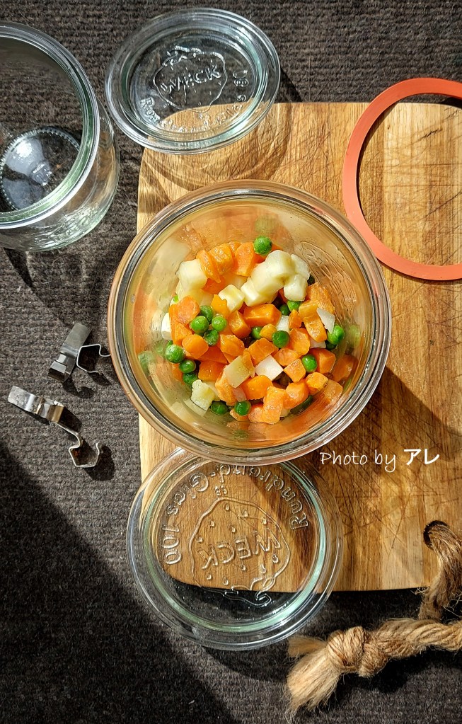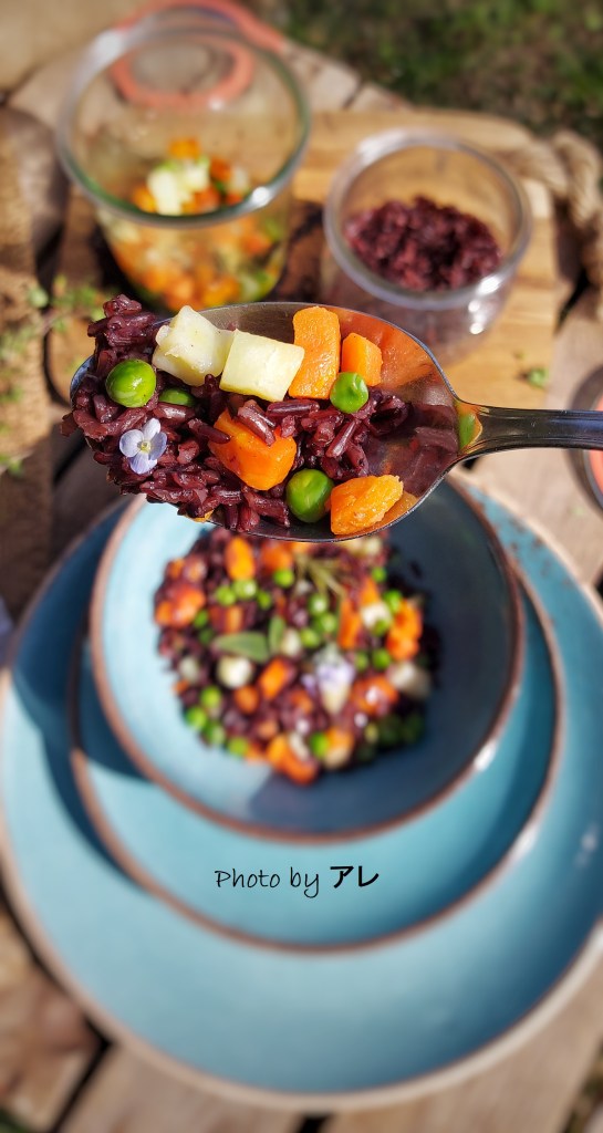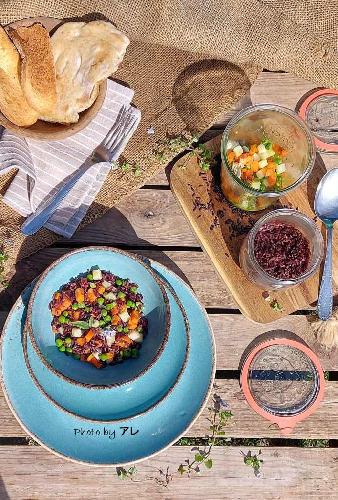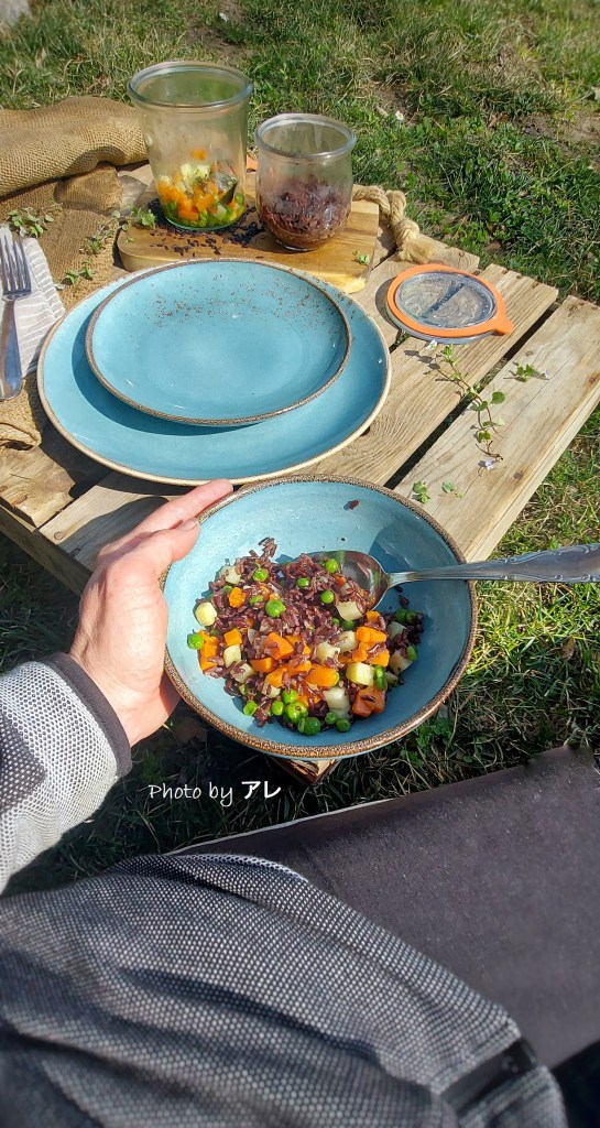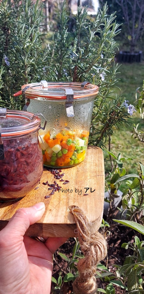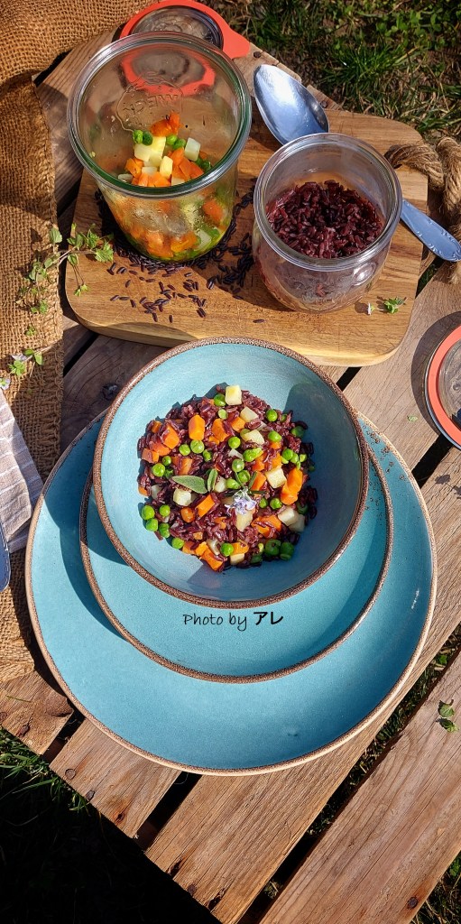 Inserire nei vasetti, uno per il riso, l’altro le verdure i vari ingredienti, salare, pepare e fare un piccolo giro di olio extravergine, mescolare un pochino poi sigillare. Programmare il microonde a 750 watt per 5 minuti, inserire i vasetti e avviare. Al termine della prima fase di cottura, aiutandovi con un canovaccio, agitare delicatamente i vasetti. Reinserirli nel microonde e programmare a metà della vostra potenza testata (io 350 watt), per altri 5 minuti e avviare. Al termine della cottura, lasciare riposare il riso per 20 minuti, durante il riposo il riso ultimerà la cottura, assorbendo tutta l’acqua. Agitare ogni tanto il vasetto per amalgamare il riso. Le verdure invece saranno pronte.