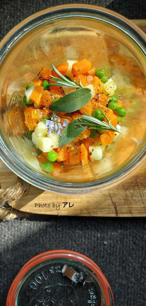 Unire il tutto e mescolare bene. La comodità della vaso cottura è il traporto, facile e soprattutto si mangia direttamente, o anche il fatto di preparare tanti vasetti che poi si possono far scaldare pochi secondi e gustare in pausa pranzo o la sera.