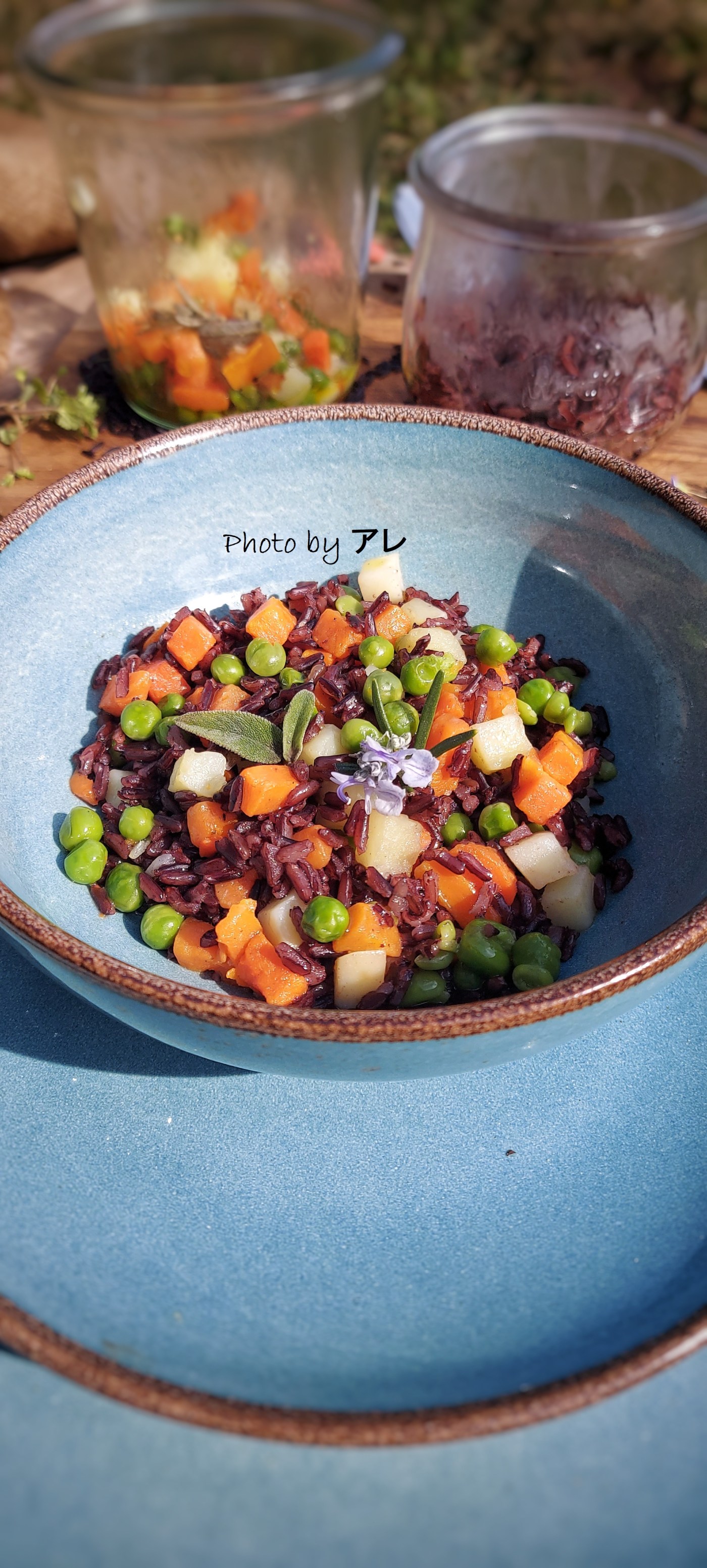 Inserire nei vasetti, uno per il riso, l’altro le verdure i vari ingredienti, salare, pepare e fare un piccolo giro di olio extravergine, mescolare un pochino poi sigillare. Programmare il microonde a 750 watt per 5 minuti, inserire i vasetti e avviare. Al termine della prima fase di cottura, aiutandovi con un canovaccio, agitare delicatamente i vasetti. Reinserirli nel microonde e programmare a metà della vostra potenza testata (io 350 watt), per altri 5 minuti e avviare. Al termine della cottura, lasciare riposare il riso per 20 minuti, durante il riposo il riso ultimerà la cottura, assorbendo tutta l’acqua. Agitare ogni tanto il vasetto per amalgamare il riso. Le verdure invece saranno pronte.