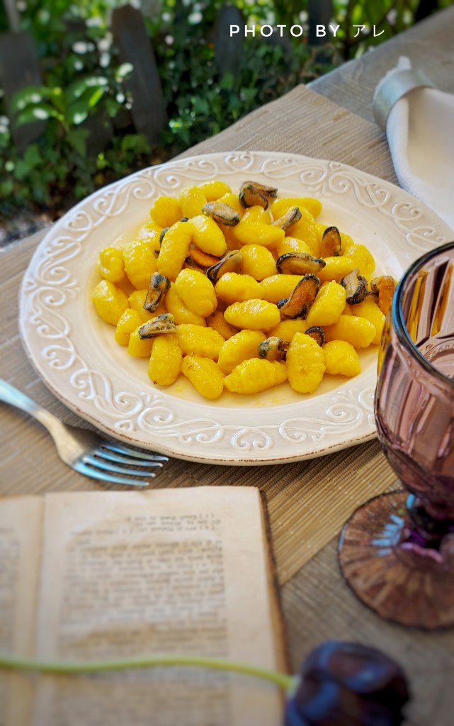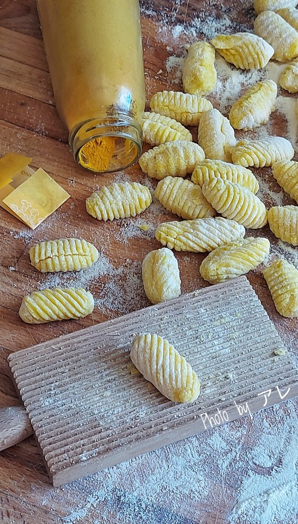 Lavare le patate, lessarle partendo dall’acqua fredda. Appena pronte scolarle, passarle con lo schiacciapatate direttamente sul piano da lavoro e allargare nel centro facendo un piccolo cratere. Aggiungere un pizzico di sale, la curcuma, lo zafferano, il burro a tocchetti e la farina poco per volta e iniziare a impastare. Meno farina richiedono le patate e più morbidi risulteranno gli gnocchi. Una volta formata una pagnotta tagliare dei pezzi con i quali ricavare dei filoncini da allungare con le mani, facendoli roteare sulla spianatoia fino allo spessore di circa 1.5 cm. Tagliarli in gnocchi di circa 2 cm. Passare ogni gnocco sui rebbi di una forchetta, esercitando una certa pressione facendoli scorrere dal basso verso l’alto, in questo modo assumono la caratteristica rigatura.