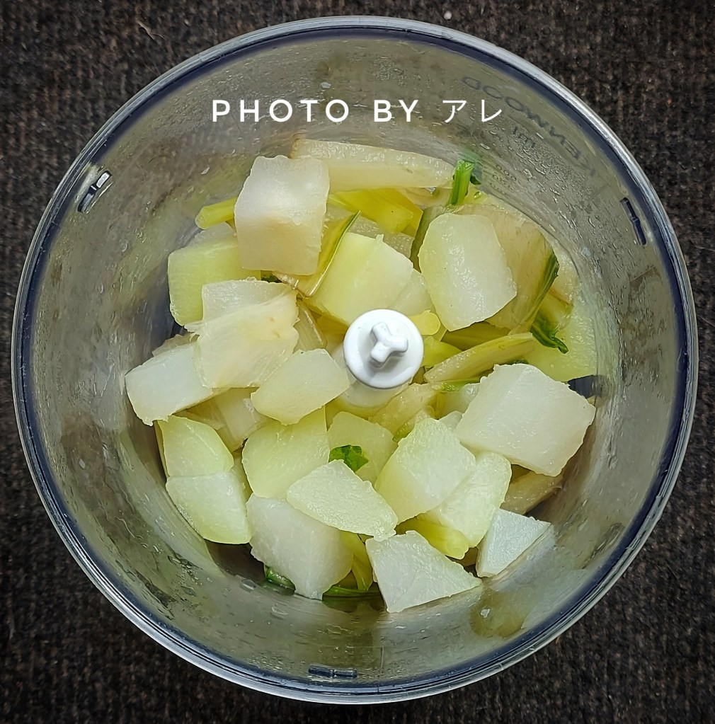 In una padella sciogliere il burro con la farina e formare il roux, aggiungere la rapa frullata, sistemare di sale e passare nuovamente con il minipimer ottenendo una crema omogenea e compatta.
