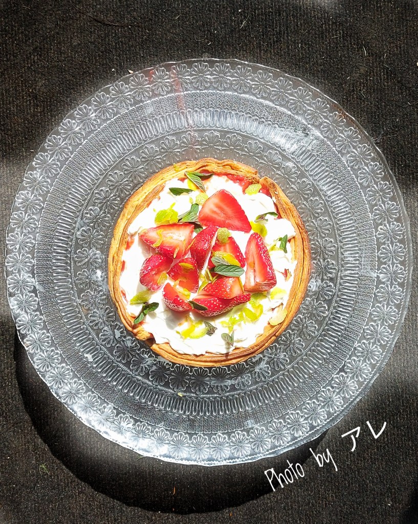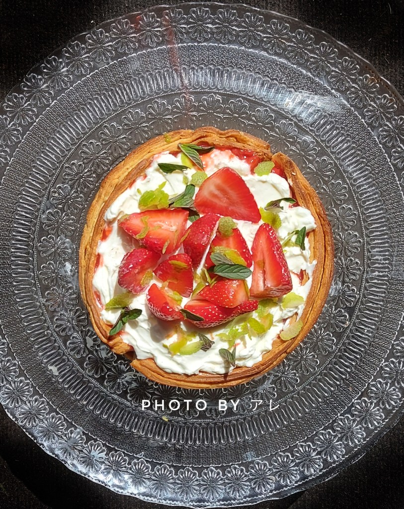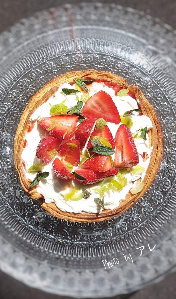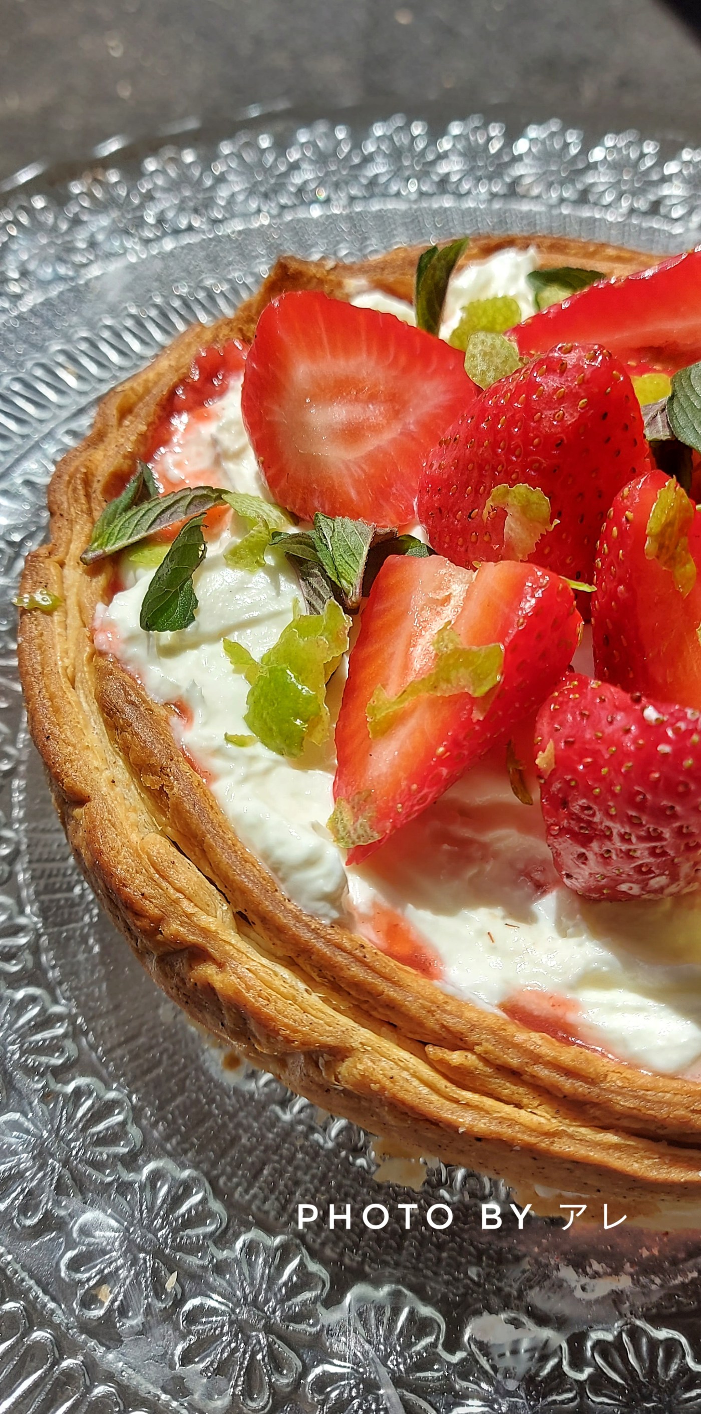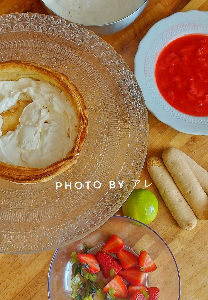 Dalla pasta sfoglia rotonda ricavare un cerchio poco più grande della base della tortiera, spennellarlo di burro fuso, bucherellarlo con una forchetta e cuocerlo in forno a 200 gradi fino a che non sarà di un bel colore dorato. In un pentolino, tagliare a pezzetti la maggior parte delle fragole, lasciandone alcune intere, le più belle, che serviranno per guarnire e aggiungere 2 cucchiai di zucchero e 20 gr di burro. Far bollire e con una forchetta schiacciare le fragole grossolanamente, spremere mezzo lime e lasciar completamente raffreddare.