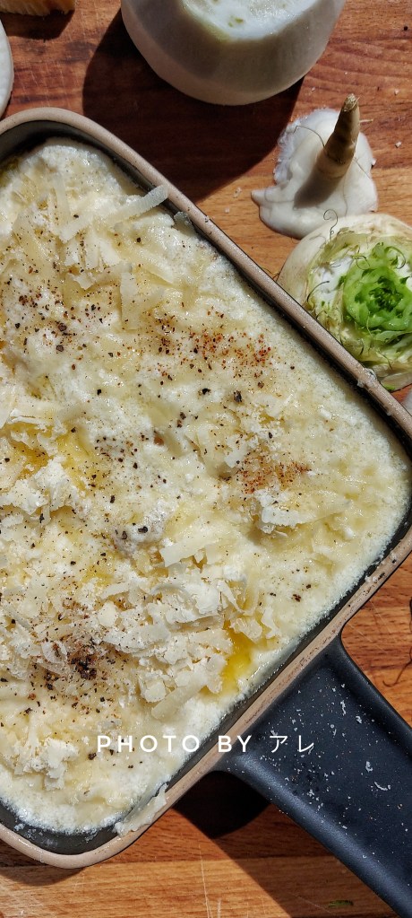 una volta tolte le foglie e spellate, affettare le rape a fette non troppo sottili. In una pirofila adatta al forno, mettere qualche fiocchetto di burro e del parmigiano, adagiare le fette leggermente sovrapposte. Aggiungere uno strato di besciamella leggera fatta con poco roux e del buon latte intero. Se volete anche solo latte. Poi un altro strato di rape e continuate fino a finire la superfice con la besciamella e del grana grattugiato, una spolverata di pepe e passarle sotto il grill fino a vedere una bella crosticina.