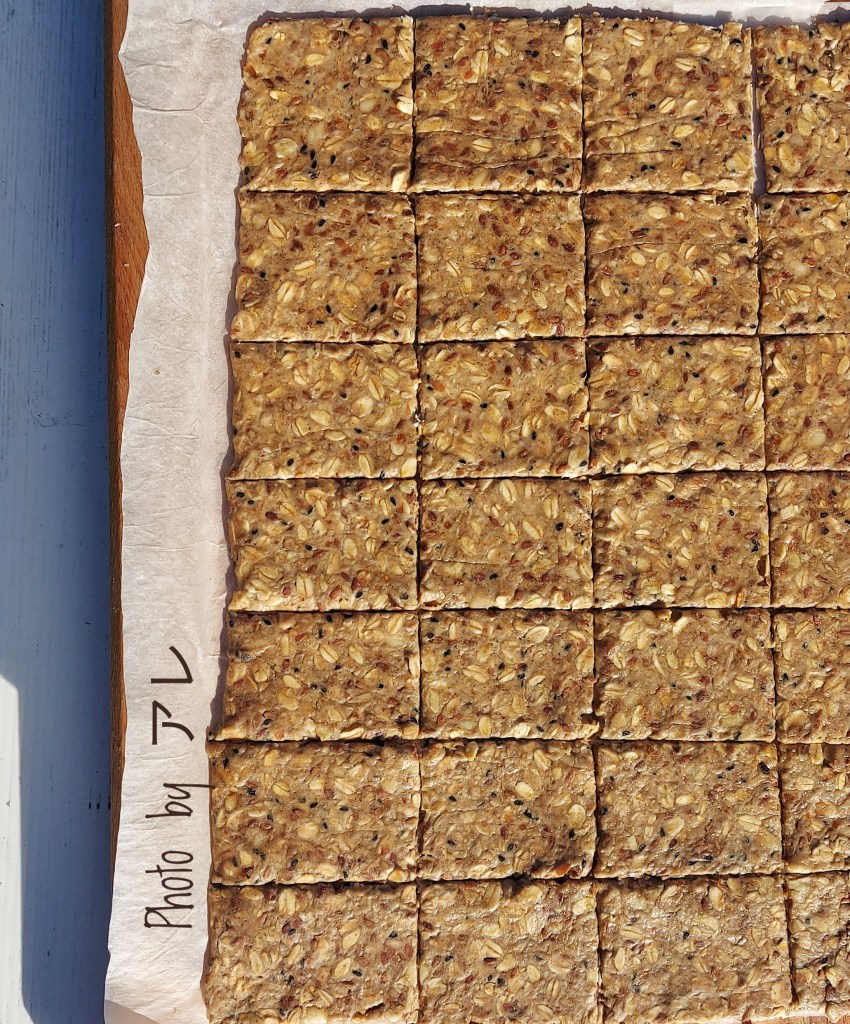 Con un coltello pre-tagliare a quadretti il composto in modo da formare i cracker poi infornare a 180° per 15 o 20 minuti.