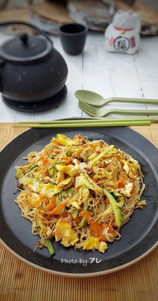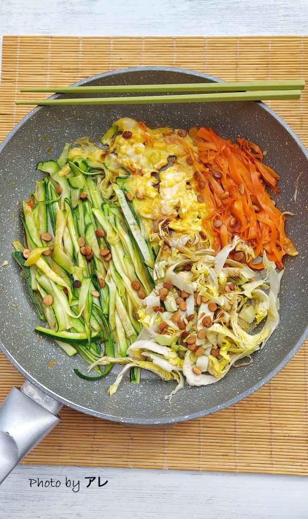 li ho cucinati con solo verdure e un uovo. Se volete una ricetta completamente vegana evitate l’uovo, se invece vi piace più piena e saporita si possono aggiungere pollo a cubetti o lonza di maiale a striscioline. In questo caso cuocere la carne per prima, facendola rosolare con del cipollotto, quando la carne sarà ben cotta e dorata aggiungere le verdure, poi l’uovo, poi gli spaghetti.