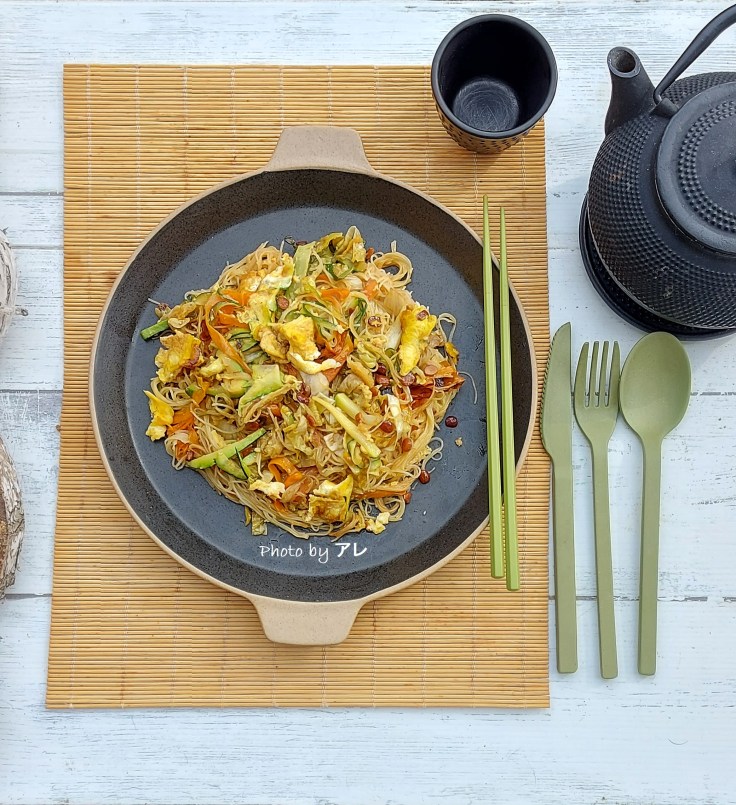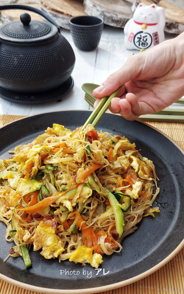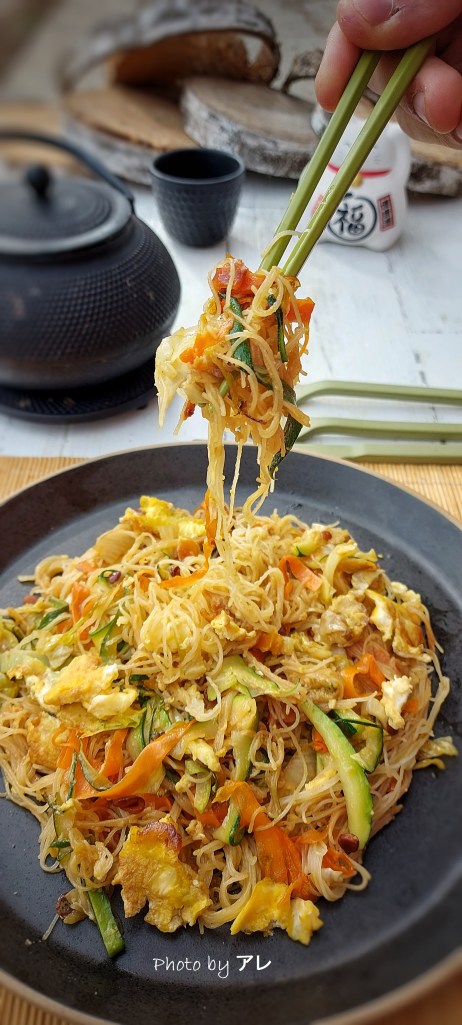 In fondo sono spaghetti di riso conditi con tante verdure. L’unica cosa che proprio non capisco è perchè a me si appiccicano tutti formando un agglomerato nel piatto che basta una forchettata che tiri su tutto in una volta. Ad ogni modo sono cosi personali che li fai con quello che vuoi, con quello che hai in frigo. Il sapore orientale lo danno le spezie e se non ce le metti, stai in pace con te stesso. l’importante è amare la loro consistenza e qui devo dire che a casina mia siamo in due su tre. Ma come dico sempre, per fortuna non siamo tutti uguali !!