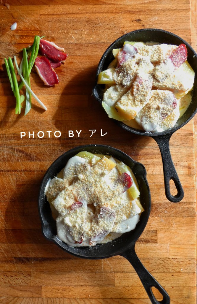 Pelare e lavare le patate, farle bollire in acqua salata per circa 15 minuti poi tagliarle a fette spesse. Imburrare leggermente le pirofile, disporre un primo strato di fette di patate, due fette di formaggio Saint-Nectaire e tre fettine di oca affumicata. Ricoprire con un cucchiaio abbondante di panna vegetale, fare un secondo strato esattamente come il primo e infine spolverare con il grana e con il pangrattato fine.