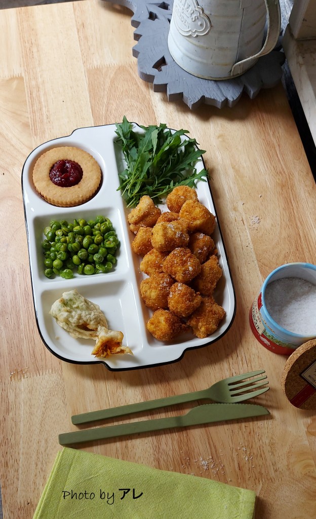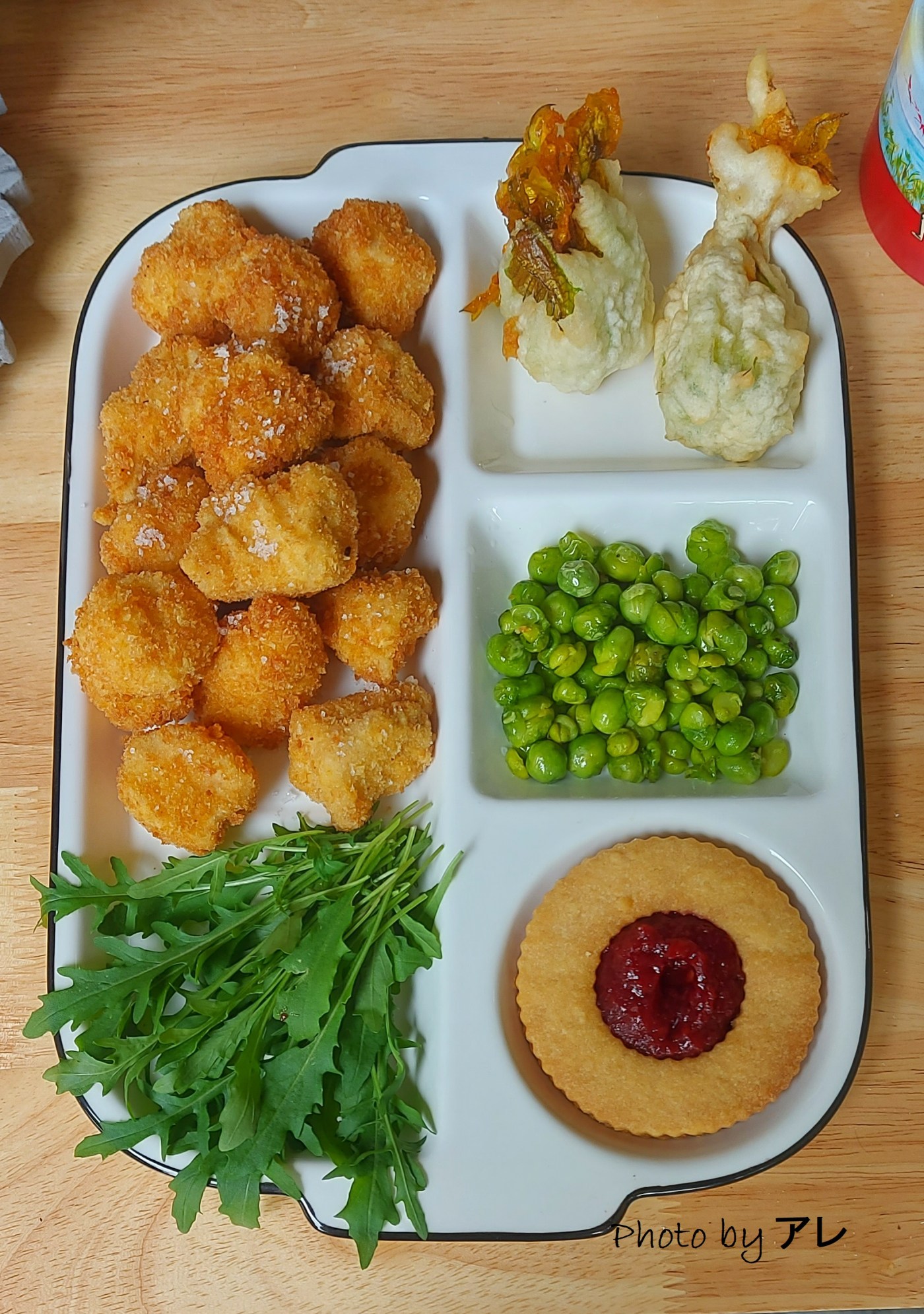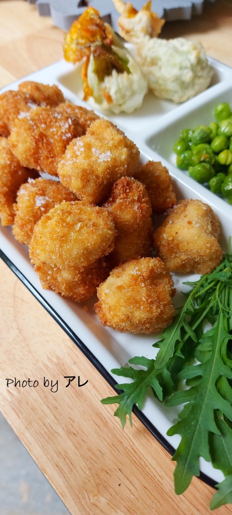 Scaldare l’olio, tagliare i filettini in bocconcini non troppo piccoli, infarinarli e poi passarli nell’uovo sbattuto, ora passarli nel pane panko cercando di farlo aderire bene, infine tuffarli nell’olio caldo. Attendere circa 3-4 minuti fino a vederli dorati. Servirli con piselli, rucola, fiori di zucca ripieni e un biscotto per un pasto completo e delizioso!