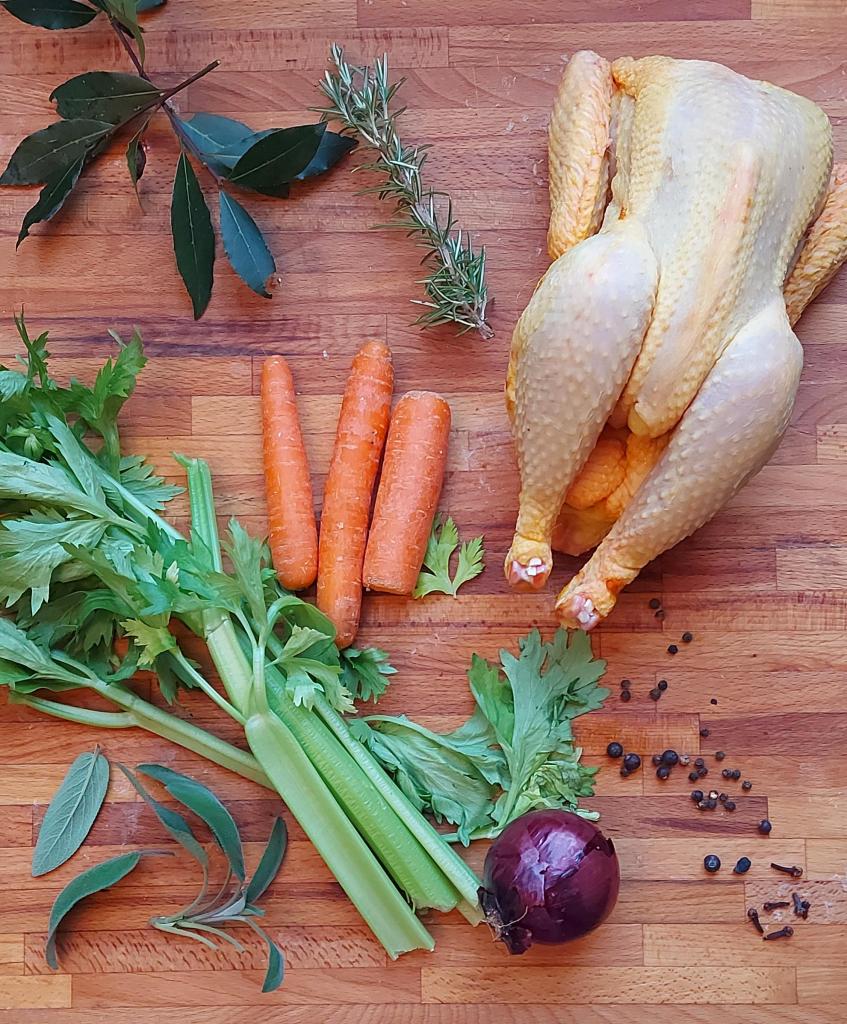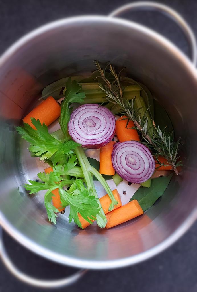 Lavare, tagliare a pezzi il cappone e metterlo in una padella alta e stretta che possa contenerlo tutto. Lavare anche la verdure e aggiungerle. Riempire di acqua cercando di lasciare la carne ben immersa sotto il livello dell’acqua, per evitare che asciughi e si scurisca. Aggiungere una manciata di sale grosso e tutti gli aromi.