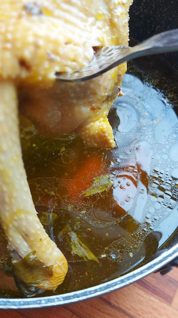 Accendere il fuoco sulla fiamma alta e, appena prende bollore, abbassare al minimo la fiamma e lasciare sobbollire per 3 ore. Una volta cotto, prelevare la carne e le verdure, filtrare il brodo e lasciarlo in un contenitore ermetico in frigo. Il grasso affiorerà tutto, si può prelevare e lasciare da parte ma come detto, io non lo elimino e, anzi lo riscaldo assieme al brodo a cucchiai a piacere.