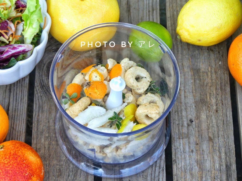 In un mixer riunite il pane senza crosta un pò spezzettato, i taralli, le scorzette degli agrumi, origano, sale e pepe e dare qualche colpo di lama per amalgamare tutto e rendere il tutto tritato molto grossolanamente. Spremere il succo del limone, dell’arancia e del pompelmo e versarne un goccio nel pane tritato, mescolare bene.