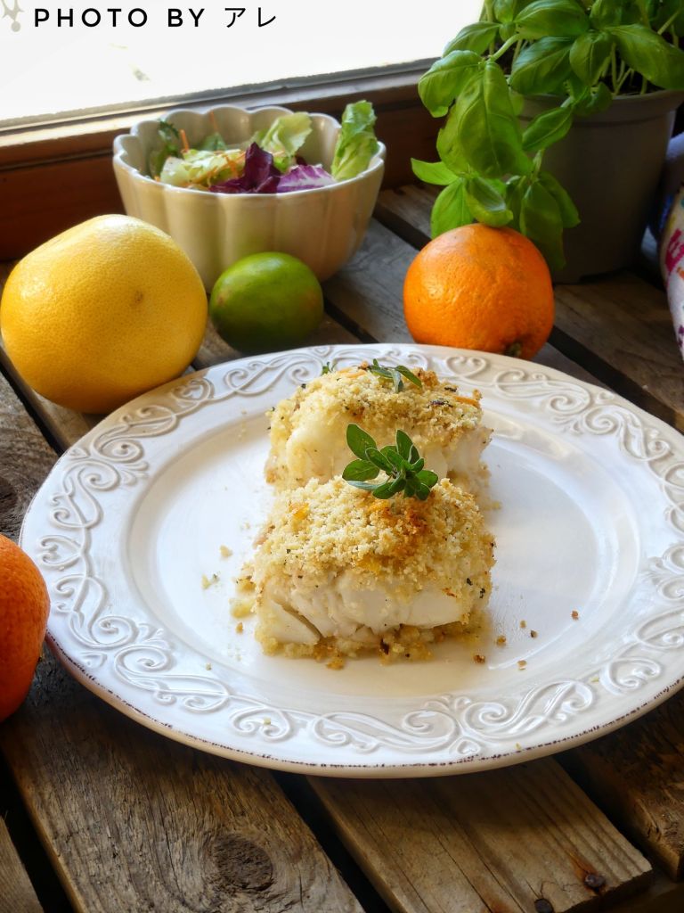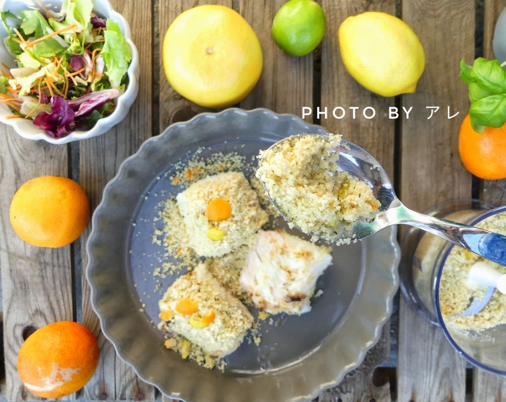 Accendere il forno con il grill a 250° In una padella antiaderente far scaldare un cucchiaio di olio. Tagliare il filetto di merluzzo in 3 tranci, metterlo nella padella e rosolare bene per 3 minuti per lato a fiamma viva. In una teglia da forno cospargere il trito di pane e agrumi sul fondo, appoggiare i tranci di merluzzo e cospargere nuovamente il trito di pane bene su ogni filetto. Irrorare con un goccio di olio il pesce e con il succo miscelato di arancia limone pompelmo.