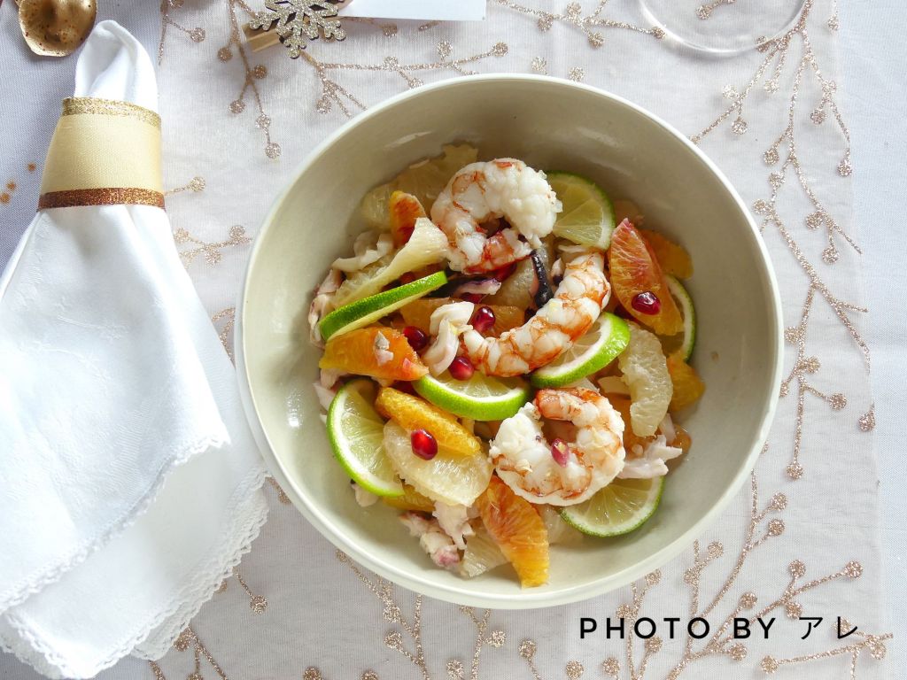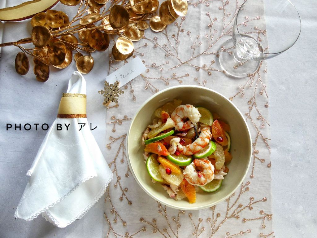 Solitamente l’insalata di mare è composta da polpo, gamberi, cozze, anelli di calamaro, seppioline. Io mi sono fermata a polpo e gamberi che si sposano perfettamente con gli agrumi!