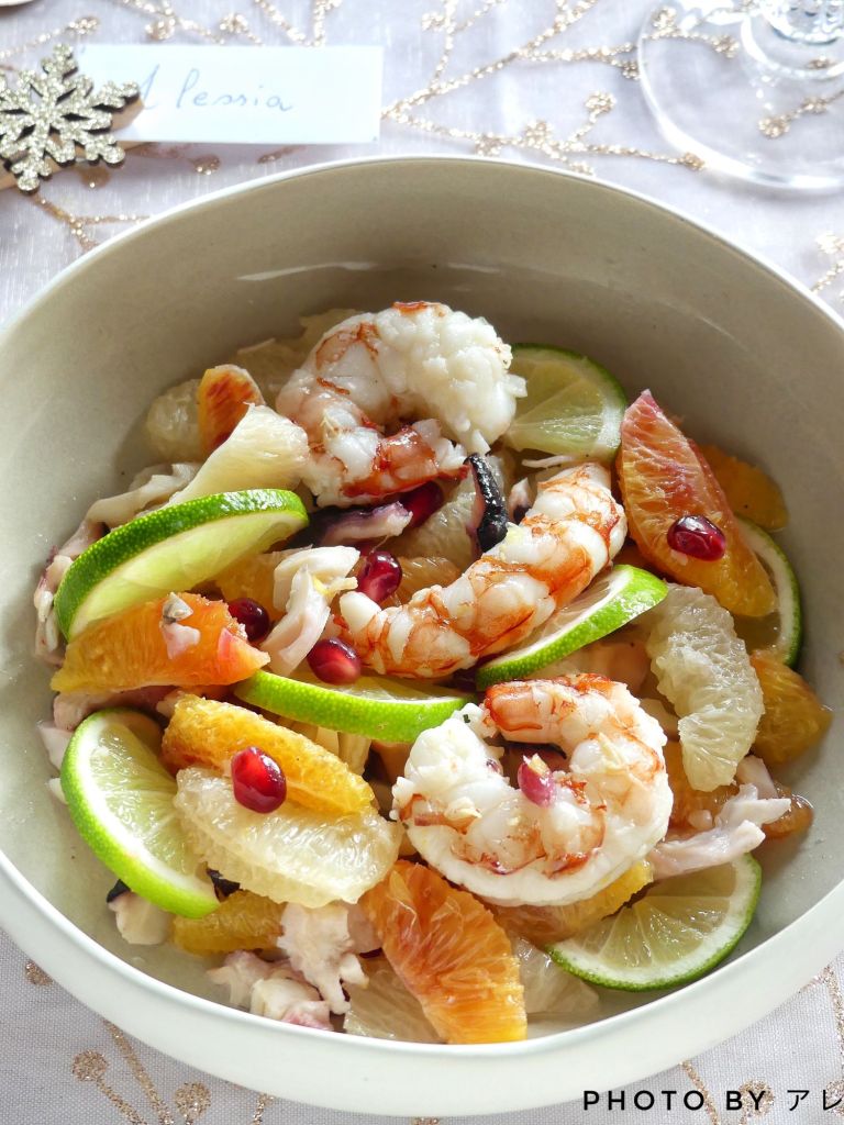 Pulire, togliere il carapace e tuffare in acqua bollente leggermente salata per 1 minuto le code di gamberone, tagliare i tentacoli di polpo a rondelle sottili oppure a pezzetti. Tuffarli con i gamberi gli ultimi 30 secondi. Scolare tutto e lasciar raffreddare. Pelare a vivo il pompelmo e l’arancia, ricavando degli spicchi, togliere bene la pellicina e riunire il tutto in una ciotola. Aggiungere fette di lime tagliate sottilmente dopo averlo bene lavato, i grani di melagrana a piacere, il pesce e irrorare con tutto il succo del pompelmo e dell’arancia che si sarà formato mentre si ricavavano gli spicchi. Servire ben freddo.