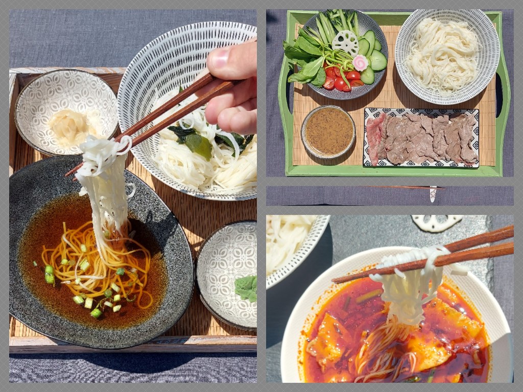 mentsuyu somen, pirikara negi butabara tsukemen somen, shabushabu somen, gomaderefumi: