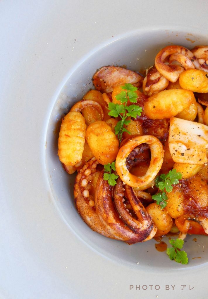 Perché con gli gnocchi ? Ho deciso questo accostamento perché i totani hanno carni più “croccanti” e la buonissima seppia invece più morbida. Mangiarli con gli gnocchi di patate morbidissimi danno una sensazione piacevolissima in bocca.