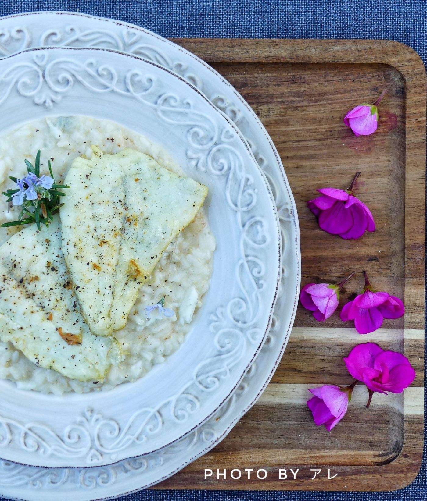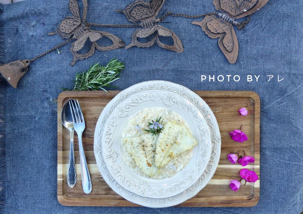Il risotto senza assolutamente il soffritto e senza assolutamente il brodo. Questo delicatissimo risotto al pesce è semplicemente sfumato al gin e cotto con acqua bollente leggermente salata. Nulla in più. I gusti del soffritto e del brodo coprirebbero troppo il sapore delicato del rombo.