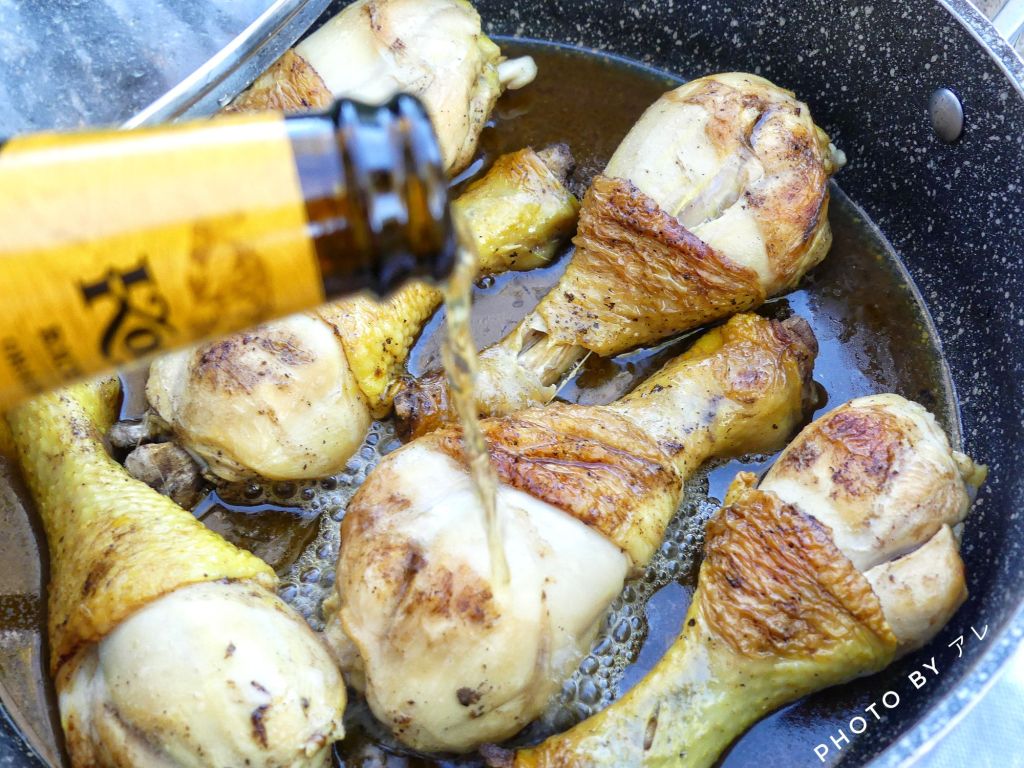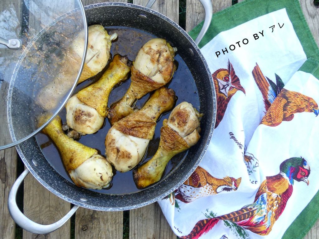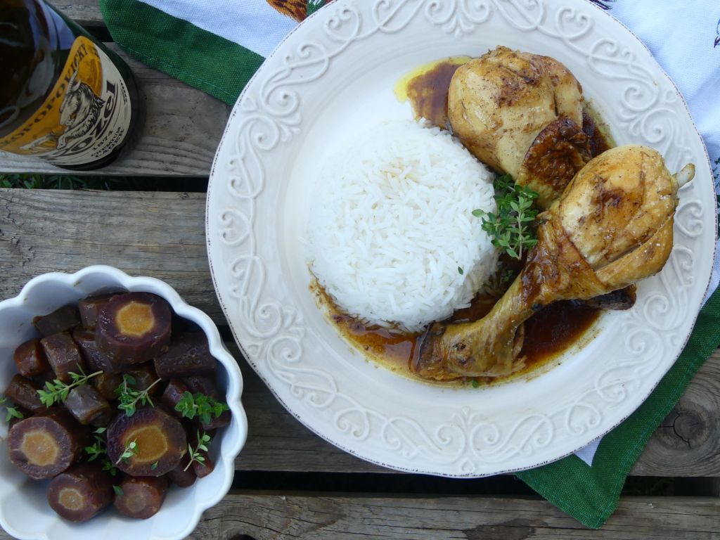 Appena finita la birra e la doratura della pelle di tutti i fusi, abbassare la fiamma, aggiungere l’estratto di carne o il fondo bruno (facoltativi), il cucchiaino di miele direttamente nel sughetto e coprire con il coperchio. Cuocere almeno 40 minuti o fino a che si vede che la carne si stacca dell’osso molto facilmente. Preparare il riso basmati semplicemente lessandolo in acqua leggermente salata. Servire con timo fresco