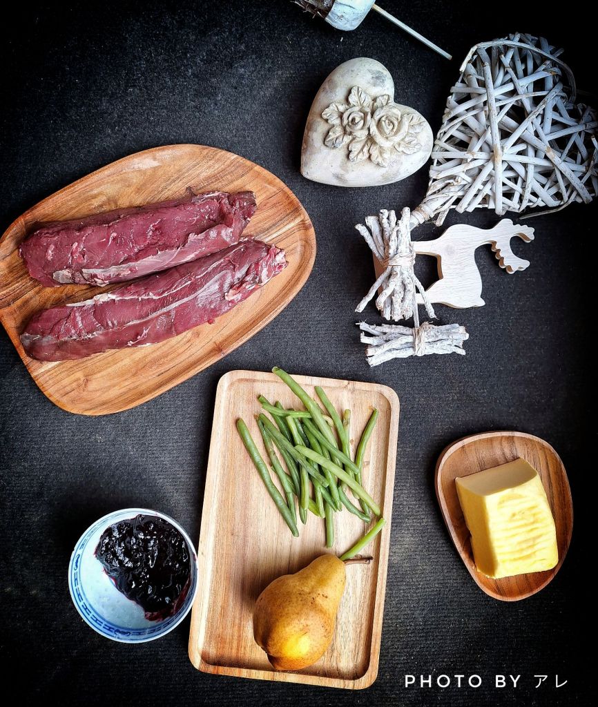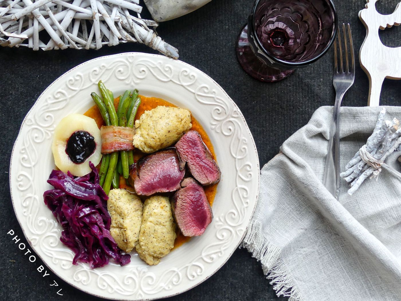 Oppure potete sciogliere del buon burro in una padella a fondo spesso, salare e pepare la lombata massaggiandola con le mani, poi rosolarla a fiamma molto alta per sigillare la carne. Sfumare con un goccio di grappa o vino rosso corposo facendo evaporare bene tutto l’alcool. Abbassare la fiamma, chiudere con il coperchio e lasciar cuocere per 15 minuti al massimo se la volete al sangue, 20 minuti o poco più se la volete più cotta. Vi sconsiglio di cuocerla troppo! Intanto mettere in una pentola a bordi alti abbondante acqua, sbucciare le pere intere senza tagliarle e senza togliere il picciolo. Farle cuocere in acqua per 15 minuti, poi scolarle e lasciarle coperte. Prima di servirle, tagliarle a spicchi togliendo il torsolo con uno scavino in modo da formare un buchetto centrale, aggiungere un cucchiaio di marmellata di mirtilli neri. Sbollentare i fagiolini in acqua salata, poi una volta cotti, passarli in padella con un filo di olio. Croccare le fette di pancetta nella friggitrice ad aria, oppure su una griglia, poi quando sono ancora calde e modellabili, avvolgerle attorno ai fagiolini. Spegnere. Scaldare il cavolo cappuccio rosso. Preparare la polenta come indicato sulla confezione. Preparare il piatto con tutti gli ingredienti e servire.