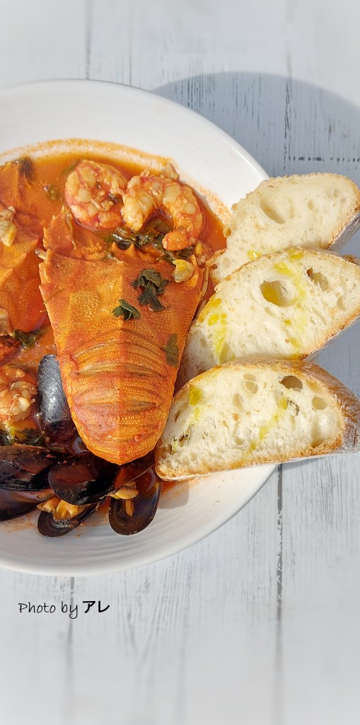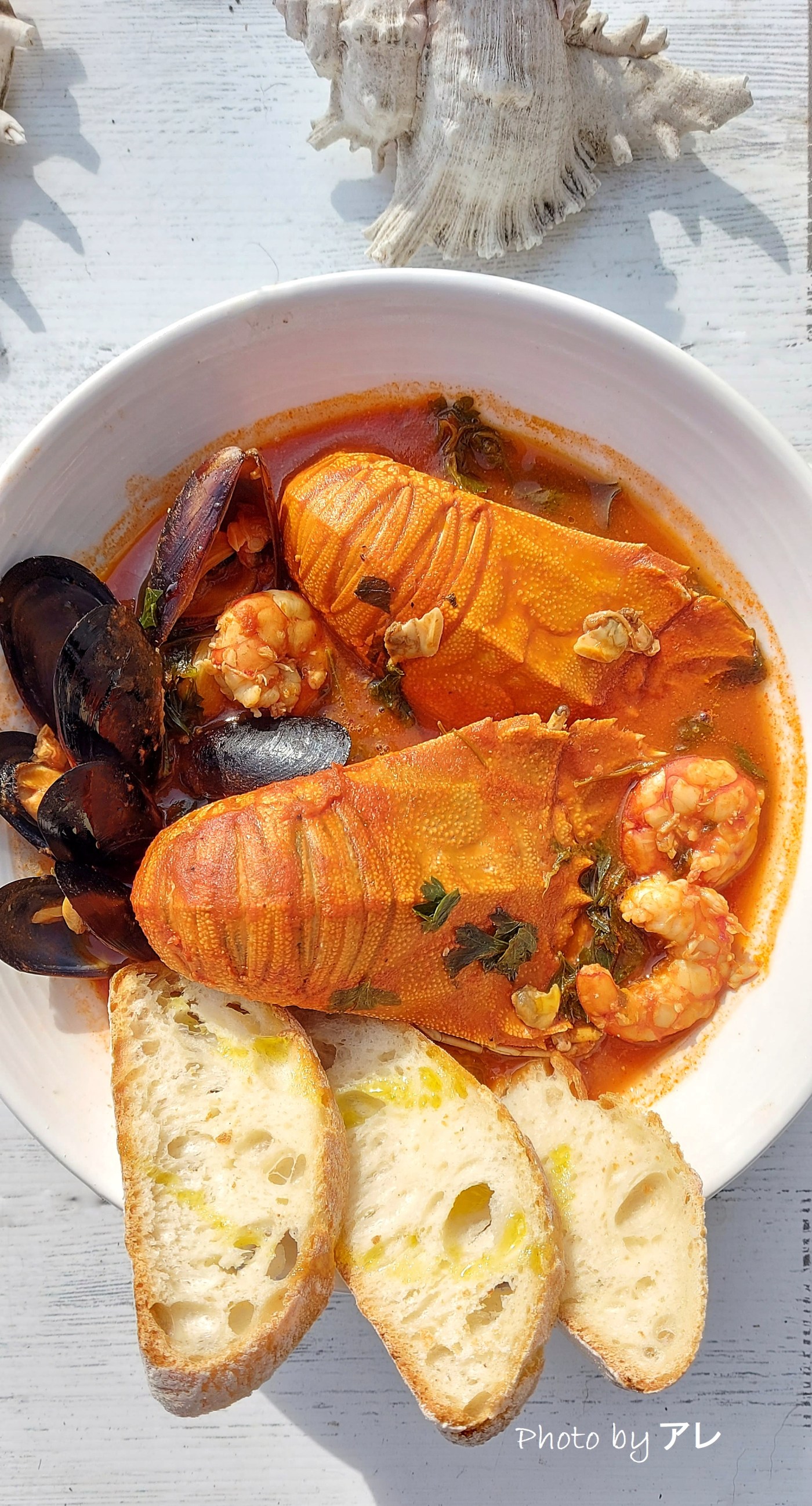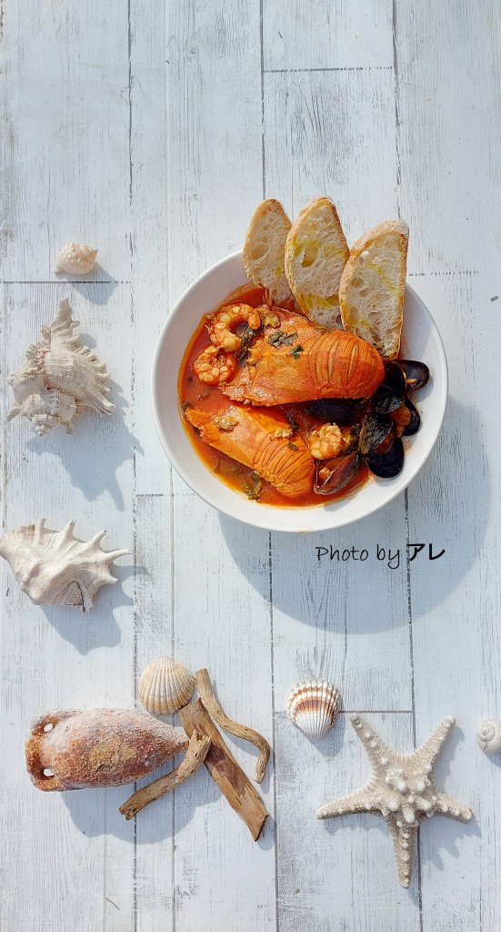 In una padella capiente far scaldare l’olio con lo spicchio di aglio schiacciato, aggiungere la passata di pomodoro e un mestolo di brodo di pesce anche liofilizzato o fumetto di pesce. Lasciar cuocere 10 minuti a fiamma dolce con coperchio. Togliere lo spicchio di aglio. Aprire le cozze, poi sgusciarle lasciandone una manciata col guscio e mettere tutto nel sugo, aggiungere anche le vongole. Prendere le code dei batti batti e inciderle nella parte sotto dove la pelle è tenera (non il carapace davanti) senza dividerle del tutto. Metterle nel sugo insieme alle code di gamberi. Cuocere 10 minuti aggiustando di sale peperoncino e pepe. Quando i crostacei saranno di un bel colore rosso arancione saranno cotti! Servire con prezzemolo fresco e pane casereccio.