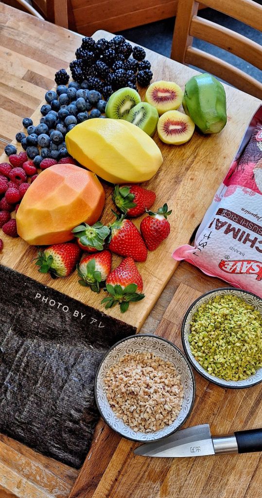 Mango, papaia, kiwi, kiwi giallo e rosso, avocado, mirtilli, lamponi, more, fragole, granella di nocciola e pistacchi, alga nori, riso per sushi, latte, zucchero semolato bianco, un bicchierino di calvados, sciroppo d’acero, sciroppo di frutti rossi, caramello salato.