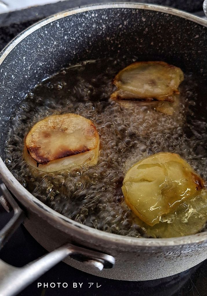 Purea agrodolce con gli aghi di rosmarino che danno una nota fresca. La salsa di soia allo yuzu per l’acidità e la senape creano una composta fantastica! Dovete provarla!
