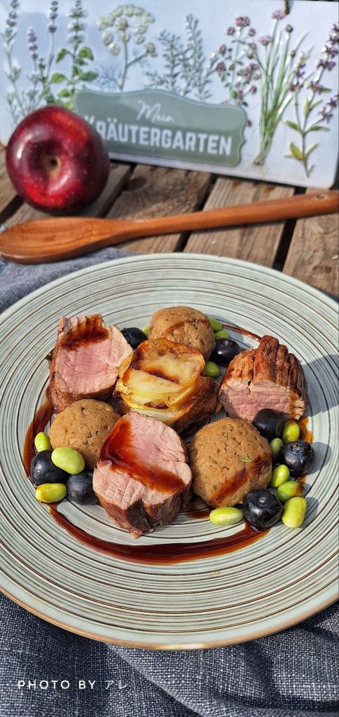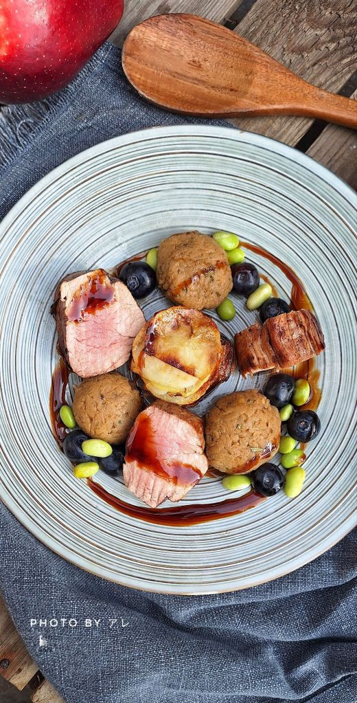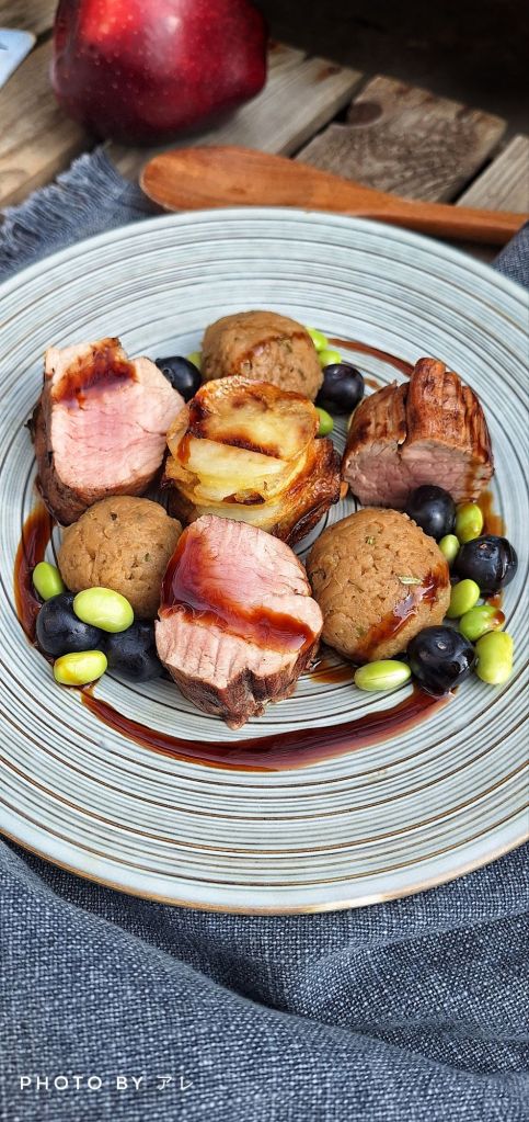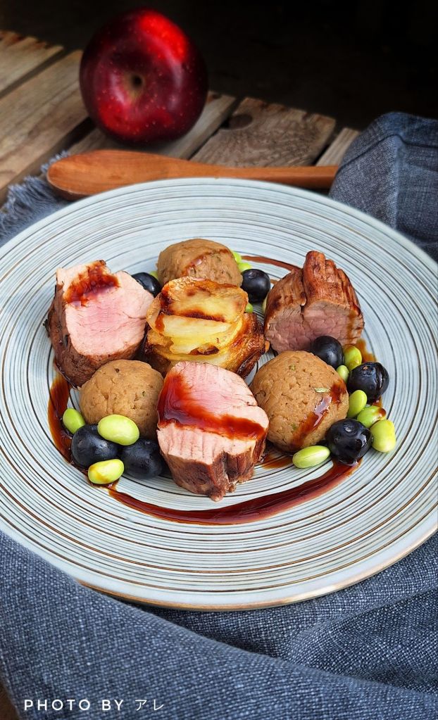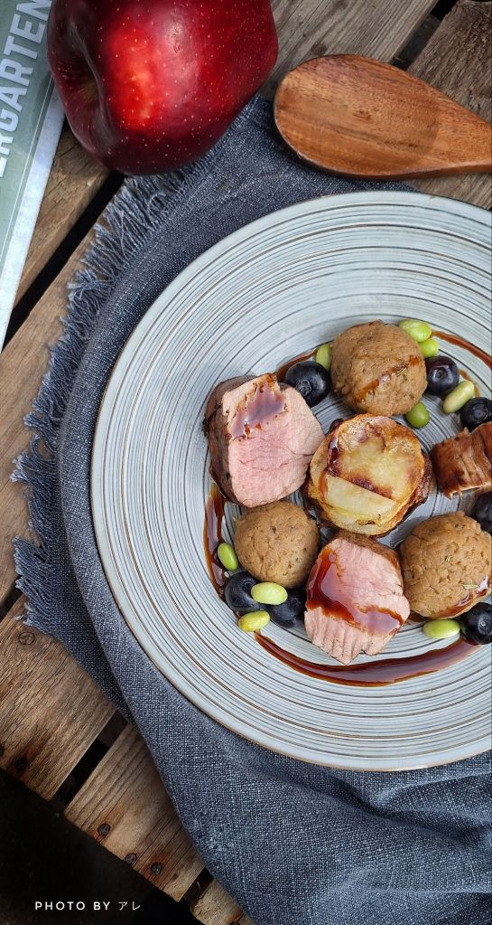 Intanto sbollentare le edamame, poi impiattare il filetto con la purea di mele tiepida, i mirtilli freschi, le edamame, la torretta di patate, i medaglioni di suino e un generoso cucchiaio di salsa Teriyaki