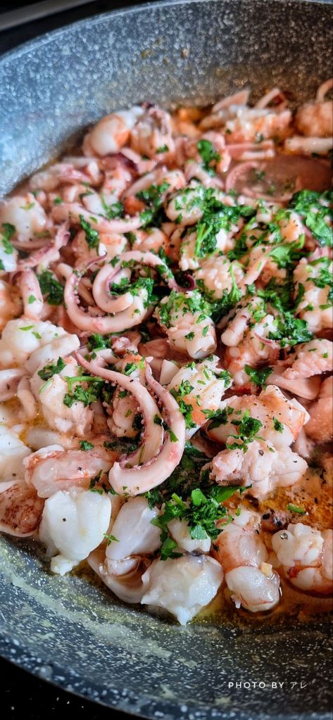 Non ho volutamente usato vino. Mi piaceva l’idea di sentire il sapore del mare senza interferenze, quando il pesce è fresco non servono né aglio, né vino, né sapori forti che lo sovrastano. Acqua calda leggermente salata formerà un sughetto di tutto rispetto.