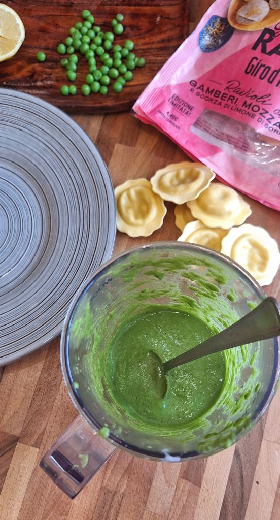 La crema è davvero veloce, l’acqua è la stessa dei ravioli, tuffate i piselli e le foglie di borragine solo per qualche istante, poi via a frullare